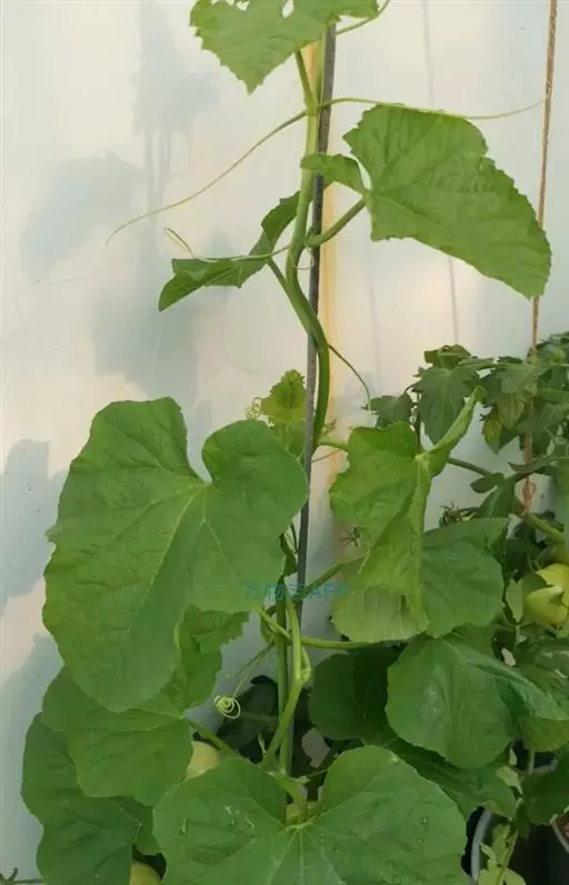 ③整枝:甜瓜一般主蔓、孙蔓均可结瓜。生产上一般以孙蔓结瓜为主。采用多蔓式整枝,即幼苗4-5片真叶时,留4片真叶进行主蔓摘心,子蔓伸出后选留3-4条健壮的主蔓,当长到5-6片真叶时再行对子蔓摘心,全株留3-4条孙蔓,孙蔓出现雌花后,在花前面留1-2片叶摘心,同时将其余枝杈全部摘除,一般全株留3-4个瓜为宜。