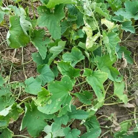 症状:主要危害瓜蔓,叶和果实也可受害。(1)病蔓开始在近节部呈淡黄色油浸状,稍凹陷,病斑椭圆至棱形,病部龟裂,并分泌黄褐色水渍,干燥后呈红褐色或黑色块状。(2)生长后期病部逐渐干枯、凹陷,呈灰白色,表面散生黑色小点,即分生孢子器及子囊壳。(3)叶片上病斑黑褐色,呈圆或不规则形状,基上有不很明显的同心轮纹,叶缘老病斑上有小黑点,病叶干枯呈星状破裂。(4)果实初期产生水渍状病斑,中央呈褐色枯死斑,星状开裂,引起瓜腐烂。(5)蔓枯病与枯萎病不同之处,病势发展缓慢,维管束不变色。不同甜瓜品种抗病性有明显差异,一般薄皮甜瓜较厚皮甜瓜抗病性强。