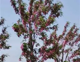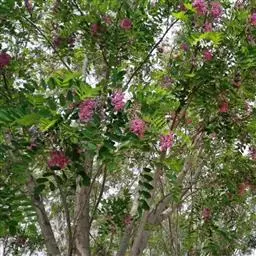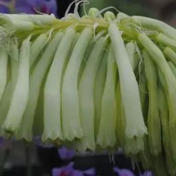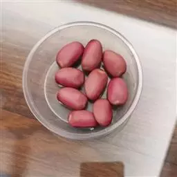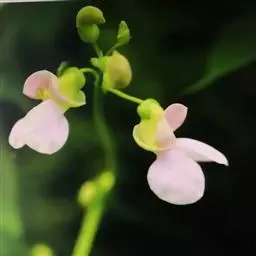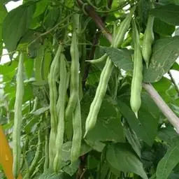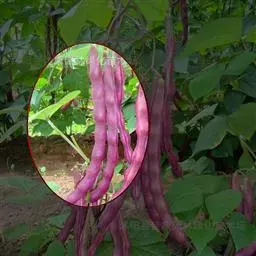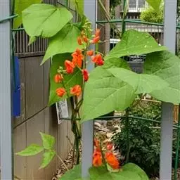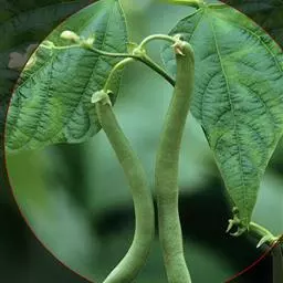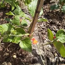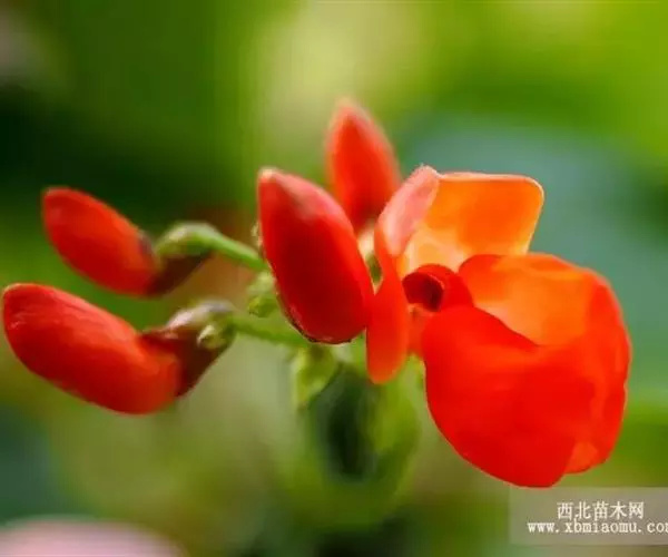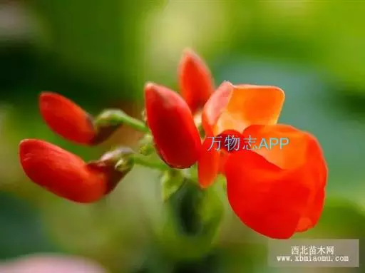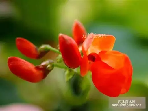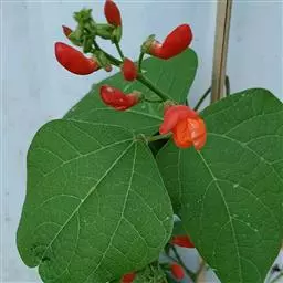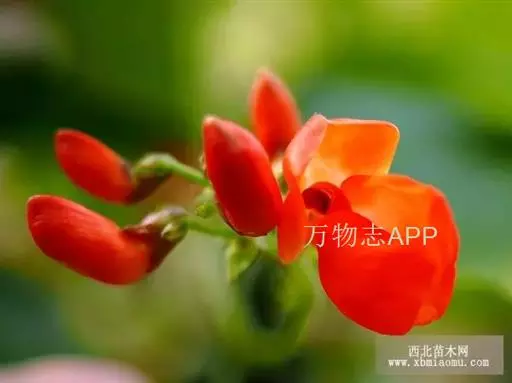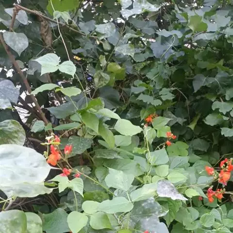 多花菜豆 多年生缠绕草本。在温带地区通常作一年生作物栽培,长可达5—7米。被毛或无毛。羽状复叶具3小叶;托叶小,不显著;小叶卵形或卵状菱形,长7.5-12.5厘米,宽有时过于长,先端渐尖或稍钝,两面被柔毛或无毛。花多朵生于较叶为长的总花梗上,排成总状花序;苞片长圆状披针形,通常和花梗等长,多少宿存,小苞片长圆状披针形,与花萼等长或较萼为长;花萼阔钟形,无毛或疏被长柔毛,萼齿远较萼管为短;花冠通常鲜红色,偶为白色,长1.5-2厘米。荚果镰状长圆形,长(5-)-16(-30)厘米,宽约1.5厘米;种子阔长圆形,长1.8-2.5厘米,宽1.2-1.4厘米,顶端钝,深紫色而具红斑、黑色或红色,稀为白色。