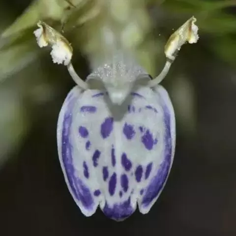 花冠白或浅黄色,长约2厘米,冠筒基部直径2毫米,稍上方呈囊状膨大,筒口宽至6毫米,外面在上部被疏硬毛或近绒毛状毛被,余部几无毛,内面冠筒近基部有毛环,冠檐二唇形,上唇直立,倒卵圆形或长圆形,长约1.2厘米,先端圆形或微缺,边缘具缘毛及长柔毛,下唇长约6毫米,3裂,中裂片倒肾形,先端深凹,基部急收缩,侧裂片宽,浅圆裂片状,长约0.5毫米,先端有针状小齿。雄蕊花丝扁平,被微柔毛,彼此粘连,花药深紫色,被柔毛。
