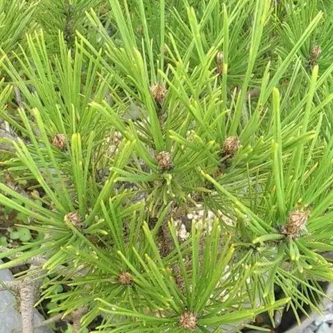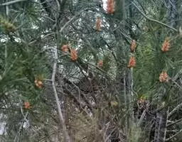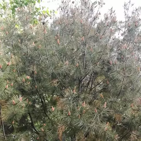 2.油松:又名短叶松、红皮松、短叶马尾松、东北黑松、紫翅油松、巨果油松。乔木,高达25米,胸径可达1米以上;树皮灰褐色或褐灰色,裂成不规则较厚的鳞状块片,裂缝及上部树皮红褐色;枝平展或向下斜展,老树树冠平顶,小枝较粗,褐黄色,无毛,幼时微被白粉;冬芽矩圆形,顶端尖,微具树脂,芽鳞红褐色,边缘有丝状缺裂。针叶2针一束,深绿色,粗硬,长10-15厘米,径约1.5毫米,边缘有细锯齿,两面具气孔线;横切面半圆形,二型层皮下层,在第一层细胞下常有少数细胞形成第二层皮下层,树脂道5-8个或更多,边生,多数生于背面,腹面有1-2个,稀角部有1-2个中生树脂道,叶鞘初呈淡褐色,后呈淡黑褐色。雄球花圆柱形,长1.2-1.8厘米,在新枝下部聚生成穗状。球果卵形或圆卵形,长4-9厘米,有短梗,向下弯垂,成熟前绿色,熟时淡黄色或淡褐黄色,常宿存树上近数年之久;中部种鳞近矩圆状倒卵形,长1.6-2厘米,宽约1.4厘米,鳞盾肥厚、隆起或微隆起,扁菱形或菱状多角形,横脊显著,鳞脐凸起有尖刺;种子卵圆形或长卵圆形,淡褐色有斑纹,长6-8毫米,径4-5毫米,连翅长1.5-1.8厘米;子叶8-12枚,长3.5-5.5厘米;初生叶窄条形,长约4.5厘米,先端尖,边缘有细锯齿。花期4-5月,球果第二年10月成熟。
