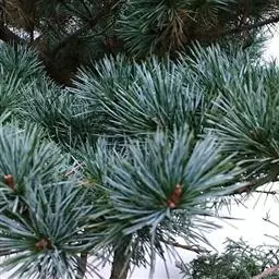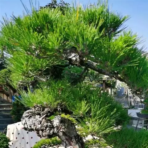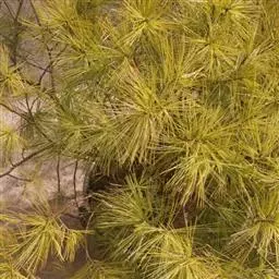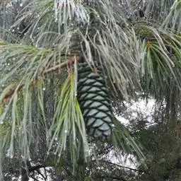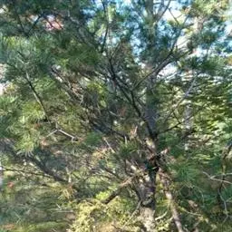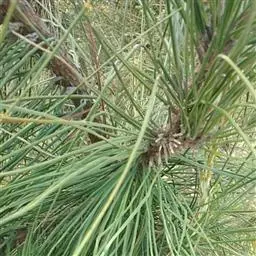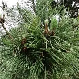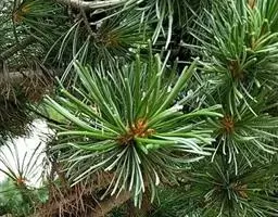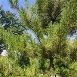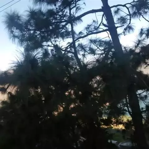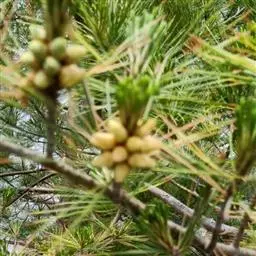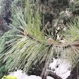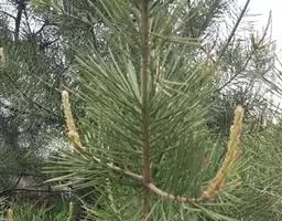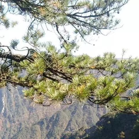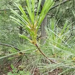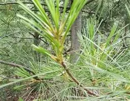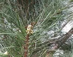 3.云南松:又名长毛松、青松、飞松。乔木,高达30米,胸径1米;树皮褐灰色,深纵裂,裂片厚或裂成不规则的鳞状块片脱落;枝开展,稍下垂;一年生枝粗壮,淡红褐色,无毛,二、三年生枝上苞片状的鳞叶脱落露出红褐色内皮;冬芽圆锥状卵圆形,粗大,红褐色,无树脂,芽鳞披针形,先端渐尖,散开或部分反曲,边缘有白色丝状毛齿。针叶通常3针一束,稀2针一束,常在枝上宿存三年,长10-30厘米,径约1.2毫米,先端尖,背腹面均有气孔线,边缘有细锯齿;横切面扇状三角形或半圆形,二型皮下层细胞,第一层细胞连续排列,其下有散生细胞,树脂道约4-5个,中生与边生并存(中生者通常位于角部);叶鞘宿存。雄球花圆柱状,长约1.5厘米,生于新枝下部的苞腋内,聚集成穗状.球果成熟前绿色,熟时褐色或栗褐色,圆锥状卵圆形,长5-11厘米,有短梗,长约5毫米;中部种鳞矩圆状椭圆形,长约3厘米,宽约1.5厘米,鳞盾通常肥厚、隆起,稀反曲,有横脊,鳞脐微凹或微隆起,有短刺;种子褐色,近卵圆形或倒卵形,微扁,长4-5毫米,连翅长1.6-1.9厘米;子叶6-8枚,长2.8-3.8厘米,边缘具疏毛状细锯齿;初生叶窄条形,长2.5-5厘米,较柔软。花期4-5月,球果第二年10月成熟。