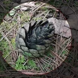为类球形或卵圆形,由木质化螺旋状排列的种鳞组成,直径4-6cm,多已破碎。表面棕色或棕褐色。种鳞背面先端宽厚隆起,鳞脐钝尖。基部有残存的果柄或果柄痕,质硬,有松脂特异香气,味微苦涩。