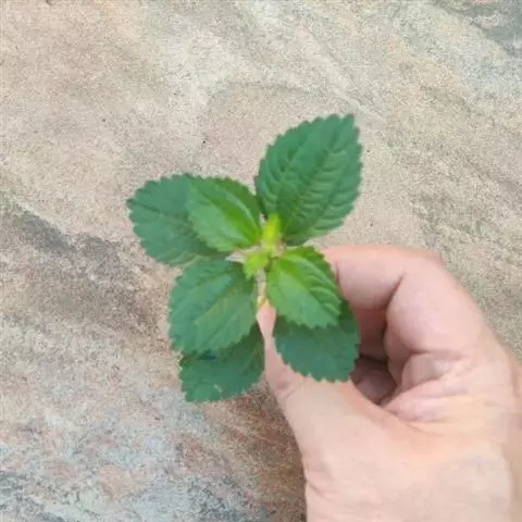 草本,无毛。根状茎匍匐,地上茎直立,多分枝,高5-30厘米,粗1.5-2.5毫米,下部裸露,节间较长,上部节间密集,干时变蓝绿色,密布杆状钟乳体。叶集生于枝顶部,同对的常不等大,多汁,宽卵形、菱状卵形或近圆形,长8-20毫米,宽6-18毫米,先端钝,近圆形或锐尖,基部宽楔形、近圆形或近截形,在近叶柄处常有不对称的小耳突,边缘全缘,稀波状,上面绿色,下面灰绿色,呈蜂巢状,钟乳体仅分布于叶上面,条形,纤细,长约0.3毫米,在边缘常整齐纵行排列一圈,基出脉3条,不明显,有时在下面稍隆起,其侧出的一对达中部边缘,侧脉2-4对,斜伸出,常不明显,细脉末端在下面常膨大呈腺点状;叶柄纤细,长5-20毫米;托叶小,三角形,长约1毫米,宿存。