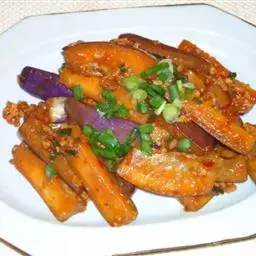 铁板茄子是一道美食,由茄子、猪肉、洋葱、姜、淀粉、大葱等制作而成,咸甜口味。不需铁板也可做铁板茄子。