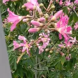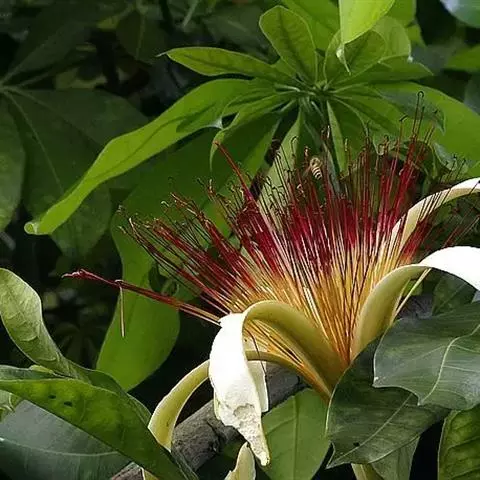 胖大海 落叶乔木,高可达40m,单叶互生,叶片革质,卵形或椭圆状披针形,长10~20cm,宽6~12cm,通常3裂,全缘,光滑无毛。圆锥花序顶生或腋生,花杂性同株;花萼钟状,深裂;雄花具10~15个雄蕊;雌花具1枚雌蕊。骨朵果1~5个,着生于果梗,呈船形,长可达24cm。种子棱形或倒卵形,深褐色和土黄色。