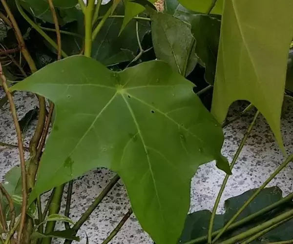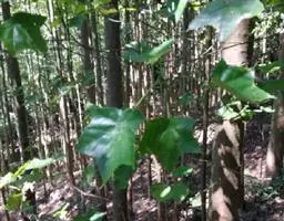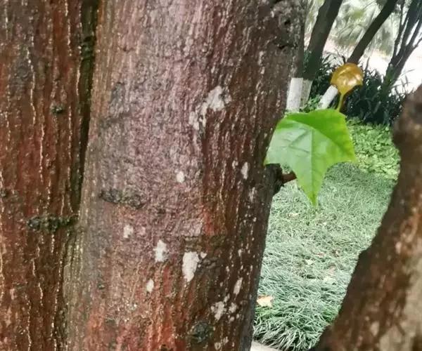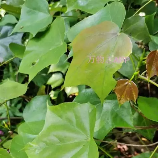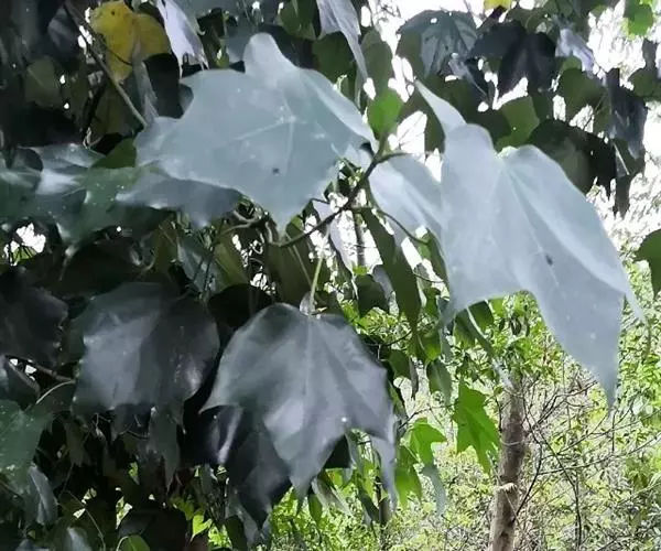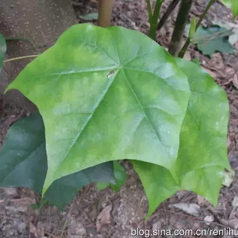 常绿乔木,高达30米;小枝粗壮,无毛,节膨大,有环状托叶痕。叶革质,阔卵圆形,全缘,或幼叶先端3浅裂,长10-13厘米,宽7-10厘米,先端短尖,基部心形;上面干后橄榄绿色,有光泽;下面黄绿色,或稍带灰色,无毛;掌状脉5条,在上面明显,在下面突起,网脉不大明显;叶柄长7-10厘米,圆筒形,无毛。