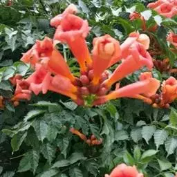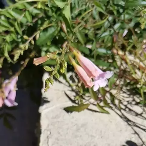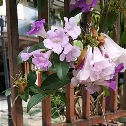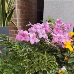 粉花凌霄,为紫葳科粉花凌霄属植物,有白花和红花等栽培品种。在适宜生长的温暖地带,可用于棚架、墙垣绿化,寒地可行盆栽。全株可入药。