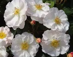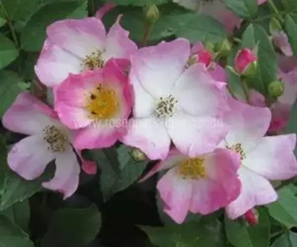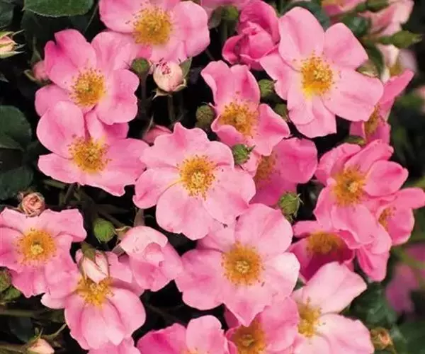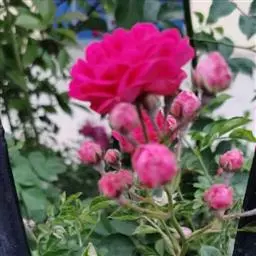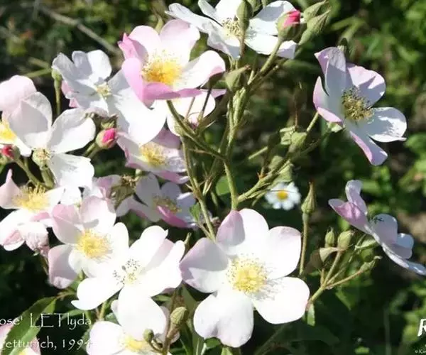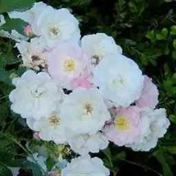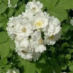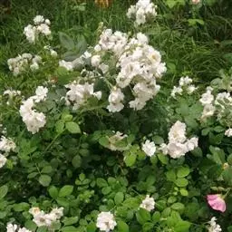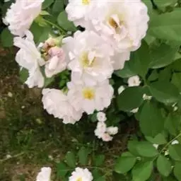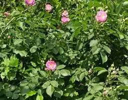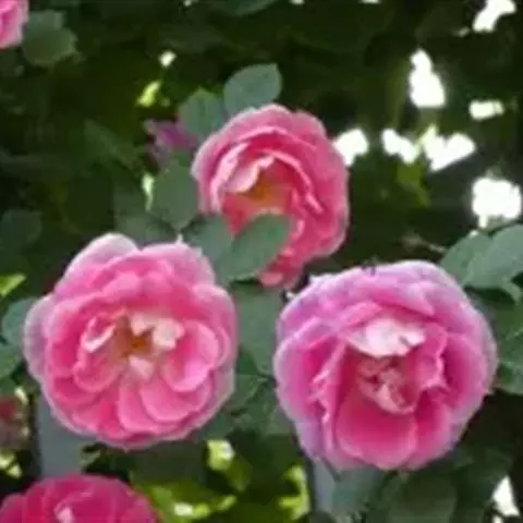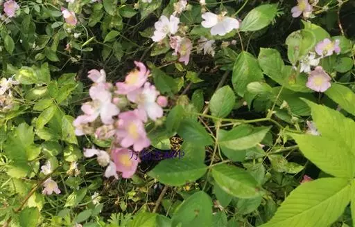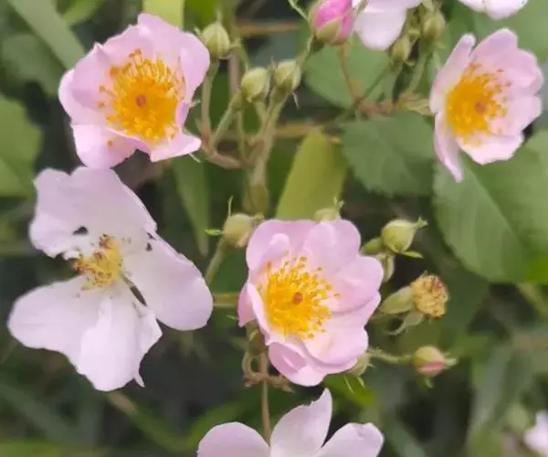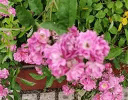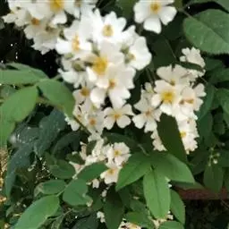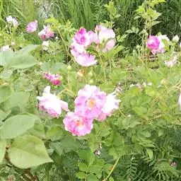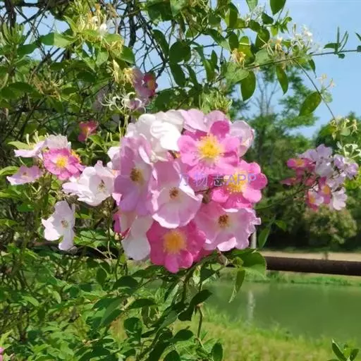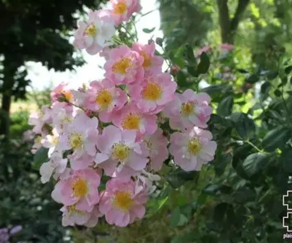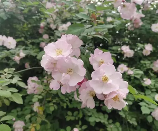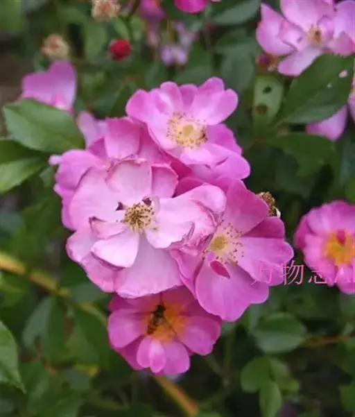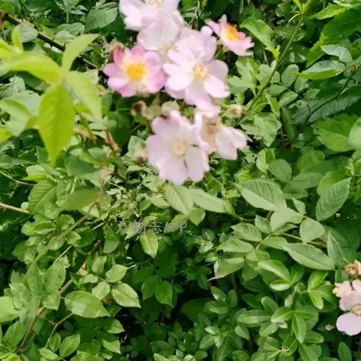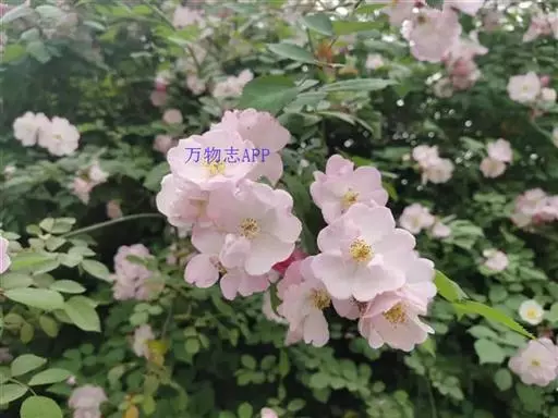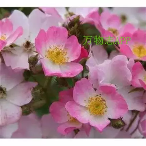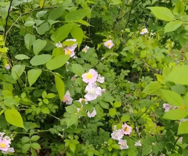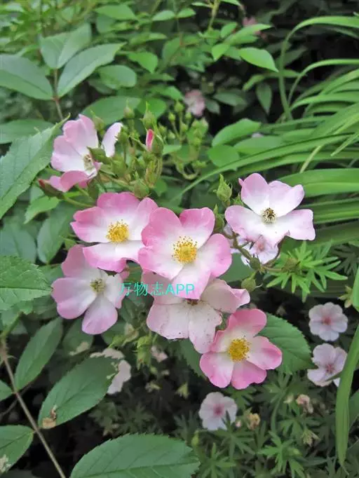 粉团蔷薇(学名:Rosa multiflora Thunb. var. cathayensis Rehd. ):攀援灌木;小枝圆柱形,通常无毛,小叶倒卵形、长圆形或卵形,边缘有尖锐单锯齿,上面无毛,下面有柔毛;花多朵,排成圆锥状花序,花直径1.5-2厘米,萼片披针形,花瓣宽倒卵形,先端微凹,基部楔形;花柱结合成束,无毛,比雄蕊稍长。果近球形,红褐色或紫褐色,有光泽,无毛,萼片脱落。系野蔷薇的一个变种,小叶较大,通常5-7。花粉红,花较大,单瓣,平顶伞房花序。果实较小,少种子或无种子。