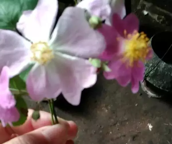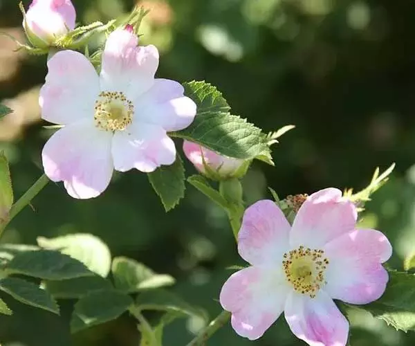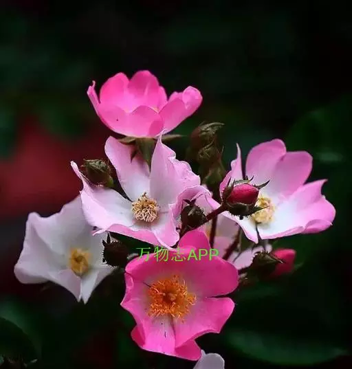 花多朵,排成圆锥状花序,花梗长1.5-2.5厘米,无毛或有腺毛,有时基部有篦齿状小苞片;花直径1.5-2厘米,萼片披针形,有时中部具2个线形裂片,外面无毛,内面有柔毛;花瓣粉红色,单瓣,宽倒卵形,先端微凹,基部楔形;花柱结合成束,无毛,比雄蕊稍长。果近球形,直径6-8毫米,红褐色或紫褐色,有光泽,无毛,萼片脱落。