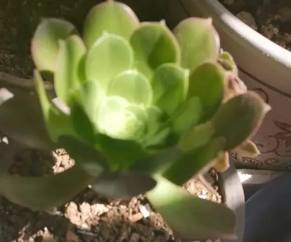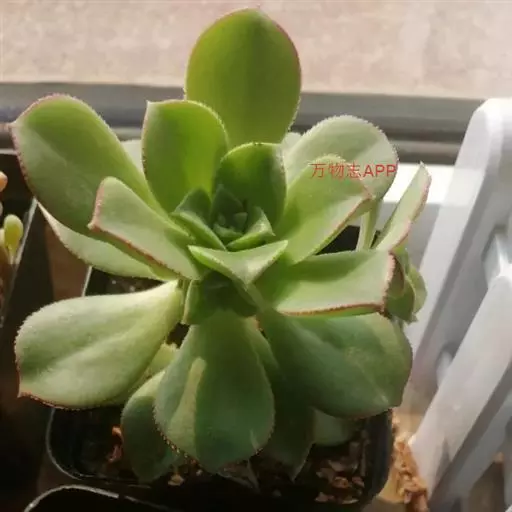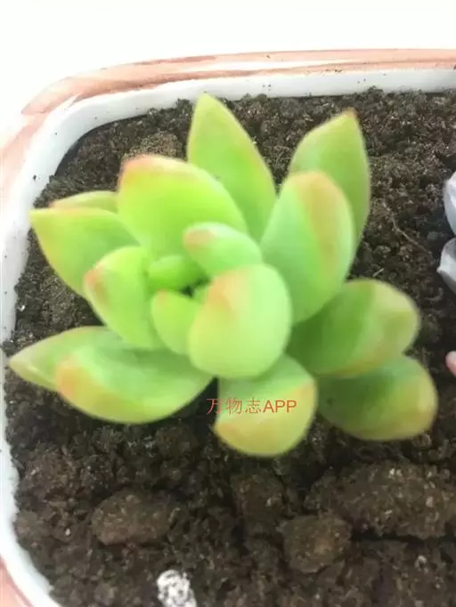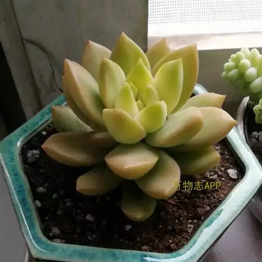 黄丽,多肉类植物,植株具短茎,肉质叶,排列紧密,呈莲座状,叶片匙形,顶端有小尖头,叶片松散。