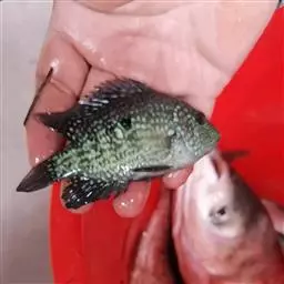 龟壳攀鲈约一年半达至成熟,体长约12厘米就能繁殖。最大体长可达25厘米以上。两性异型不明显,雄性头略大圆钝,具较浓暗的婚姻色,雌性头小略尖,腹部略胀。繁殖期于春夏五至七月,在水生沉水及挺水植物茂盛处产卵,大型成熟个体可产约二千粒浮性卵,具领域及亲代抚育行为。适应适宜:pH6~9,硬度 : 36~447 PPM,生长水温:18~35℃,最适生长水温:25~30℃,低于15℃停止摄食,临界水温:10℃,致死亡水温:约5℃,属热带、亚热带淡水鱼。亲鱼按1或接近1配对。雌 雄:1:1。雌雄亲鱼的鉴别:繁殖季节雌鱼生殖孔凸出且尖,腹部较大,轻压肛门可挤出少许成熟的卵粒,尾部黑斑略显菱形;雄鱼普遍个体较小,体型较长且不够丰满,生殖孔内凹,成熟的雄鱼轻轻挤压肛门有白色精液流出,尾部黑斑略显椭圆形。 龟壳攀鲈幼鱼 龟壳攀鲈一个月龄