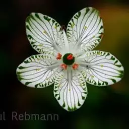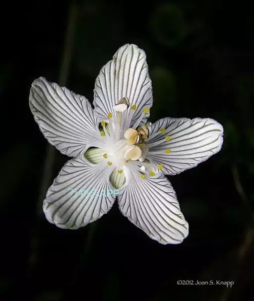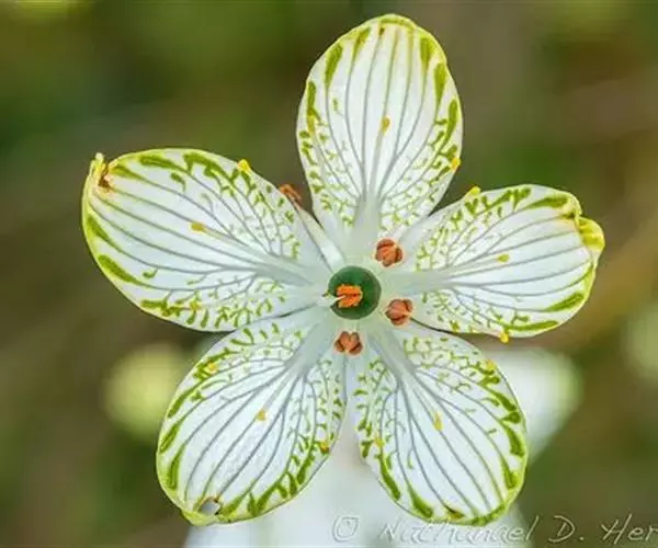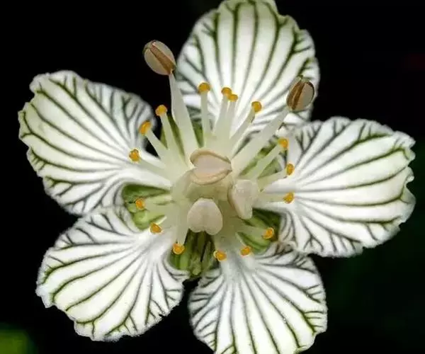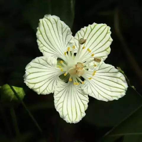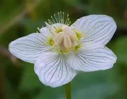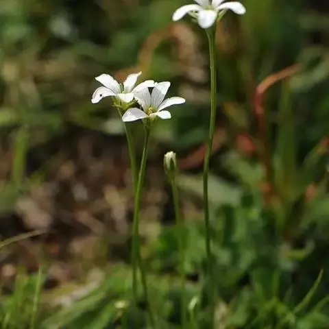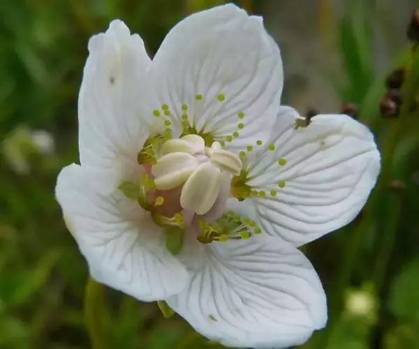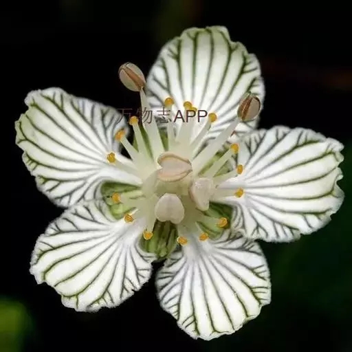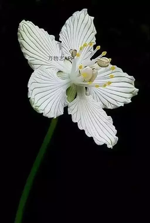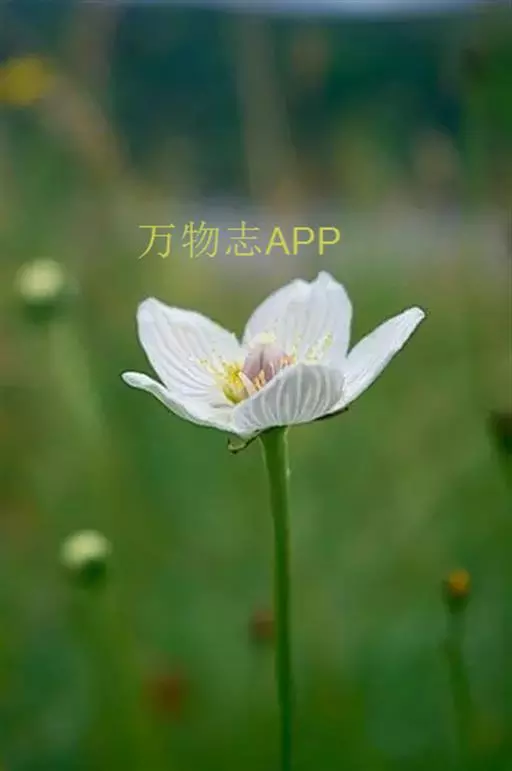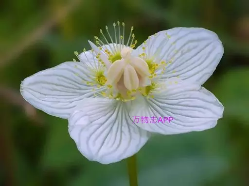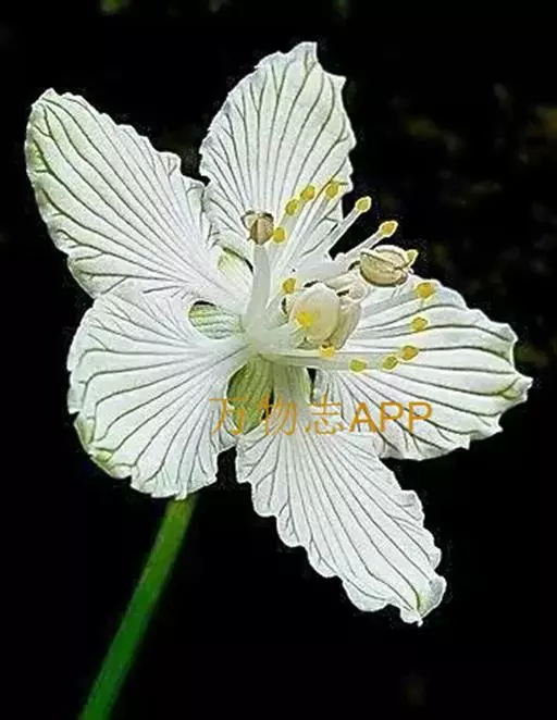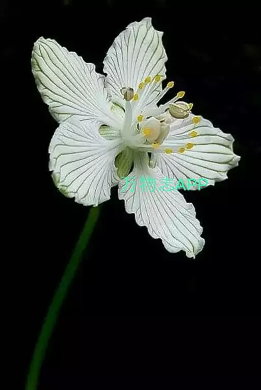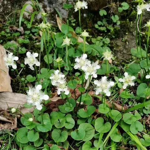 多年生草本,高达30-50cm。全株无毛。根茎短,近球形。基生叶丛生;叶柄长2.5-6cm;叶片卵圆形至心形,长1-3cm,宽1.5-3.5cm,先端钝圆或锐尖,基部心形,全缘,花茎中部生1无柄叶片,基部抱茎,与基生叶同形。花单生顶端,白色至浅黄色,直径2-3.5cm,形似梅花;萼片5,椭圆形,长约5mm;花瓣5,平展,卵状圆形,长约1cm,先端圆;雄蕊5,与花瓣互生;假雄蕊5,上半部11-22丝裂,裂片先端有头状腺体;心皮4,合生,子房上位,卵形;花柱极短,顶端4裂。蒴果,上部4裂。种子多数。花期7-8月,果期8-9月。