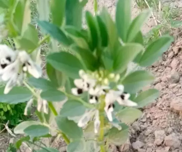 蚕豆 花越年或一年生草本,高30-180cm。茎直立,不分枝,无毛。偶数羽状复叶;托叶大,半箭头状,边缘白色膜质,具疏锯齿,无毛,叶轴顶端具退化卷须;小叶2-6枚,叶片椭圆形或广椭圆形至长形,长4-8cm,宽2.5-4cm,先端圆形或钝,具细尖,基部楔形,全缘。