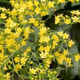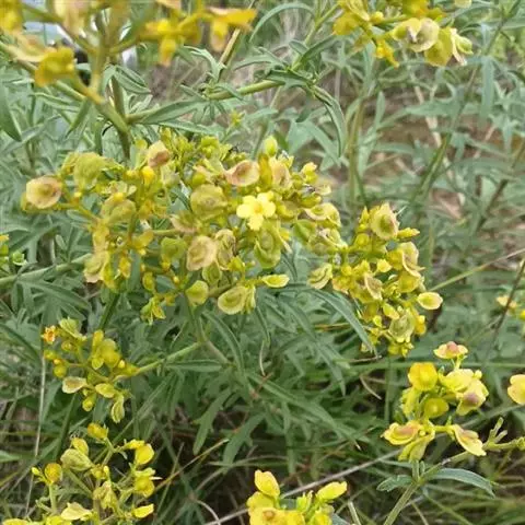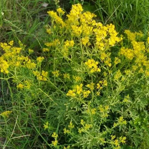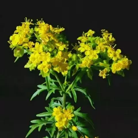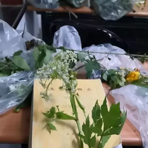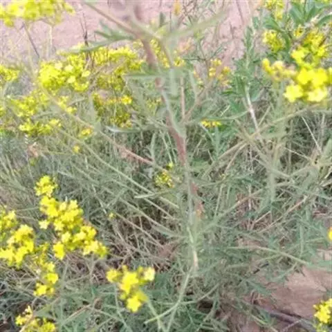 糙叶败酱( Patrinia rupestris Juss.subsp.scabra H.J.Wang),败酱科植物,多年生草本,茎丛生,茎上部多分枝,叶对生,裂片倒披针形、狭披针形或长圆形,聚伞花序顶生,呈伞房状排列,花小,黄色,花冠合瓣,果实翅状,卵形或近圆形,种子位于中央。
