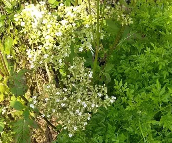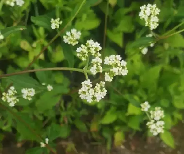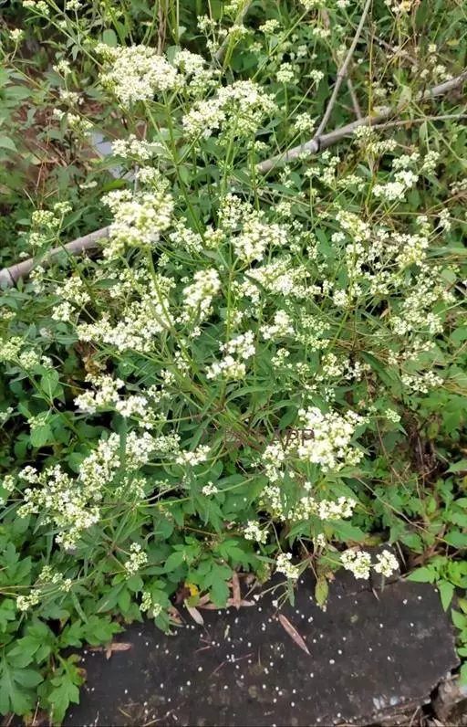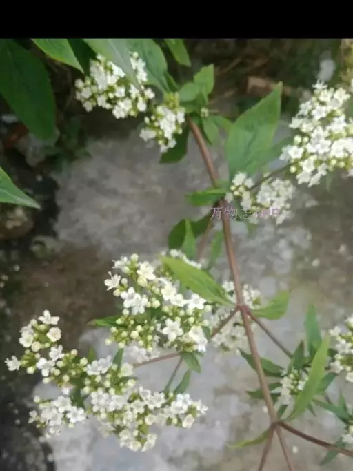 由聚伞花序组成顶生圆锥花序或伞房花序,分枝达5-6级,花序梗密被长粗糙毛或仅二纵列粗糙毛;总苞叶卵状披针形至线状披针形或线形;花萼小,萼齿5,浅波状或浅钝裂状,长0.3-0.5毫米,被短糙毛,有时疏生腺毛;花冠钟形,白色,5深裂,裂片不等形,卵形、卵状长圆形或卵状椭圆形,长(0.75-)1.25-2毫米,宽1.1-1.65(-1.75)毫米,蜜囊顶端的裂片常较大,冠筒常比裂片稍长,长1.5-2.25(-2.6)毫米,宽1.7-2.3毫米,内面有长柔毛,筒基部一侧稍囊肿;雄蕊4,伸出;子房下位,花柱较雄蕊稍短。瘦果倒卵形,与宿存增大苞片贴生;果苞倒卵形、卵形、倒卵状长圆形或椭圆形,有时圆形,长(2.8-)4-5.5(-6.5)毫米,宽(2.5-)4-5.5(-8)毫米,顶端钝圆,不分裂或微3裂,基部楔形或钝,网脉明显,具主脉2条,极少有3条的,下面中部2主脉内有微糙毛。花期8-10月,果期9-11月。