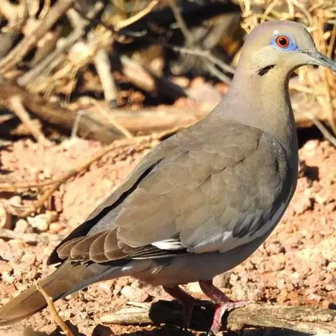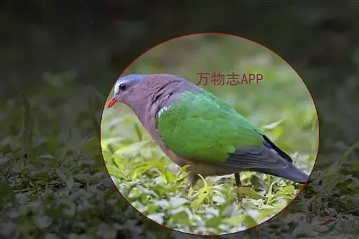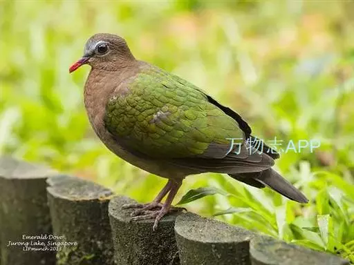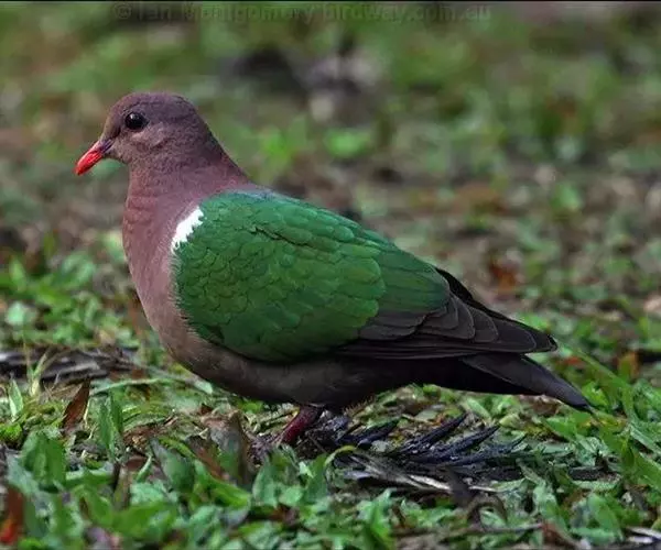 中等体型(25厘米)、尾甚短的地栖型斑鸠。下体粉红,头顶灰色,额白,腰灰,两翼具亮绿色。雌鸟头顶无灰色。飞行时背部两道黑色和白色的横纹清晰可见。 虹膜-褐色;嘴-红色,嘴尖橘黄;脚-红色。