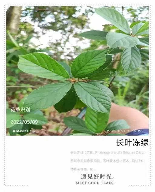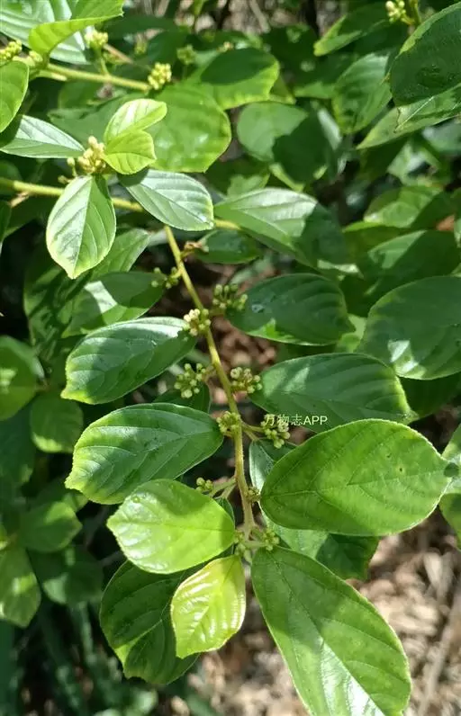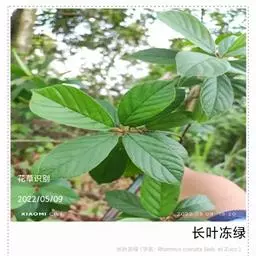 长叶冻绿(学名:Rhamnus crenata Sieb. et Zucc.)是鼠李科鼠李属植物。落叶灌木或小乔木,高达7米;幼枝带红色,被毛,后脱落,小枝被疏柔毛。叶纸质,倒卵状椭圆形、椭圆形或倒卵形,稀倒披针状椭圆形或长圆形。花数个或10余个密集成腋生聚伞花序,总花梗长4-10,稀15毫米。核果球形或倒卵状球形,绿色或红色;种子无沟。花期5-8月,果期8-10月。
