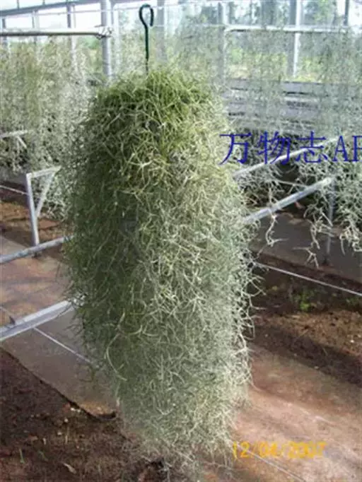 松萝凤梨,凤梨科,铁兰属,本种耐寒力极强,弗吉尼亚自然生长的成年植株可以忍受零下17度短期低温。北纬35度以南的秦岭淮河流域东部低地,利用北美落羽杉造林后,可引种弗吉尼亚种源成年松萝凤梨,让其攀爬在林内,能够自然过冬。人工栽培可悬空吊垂任其向下生长,外形似地衣类的松萝。