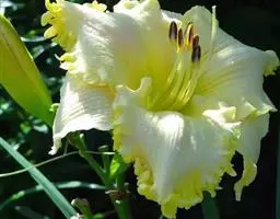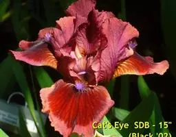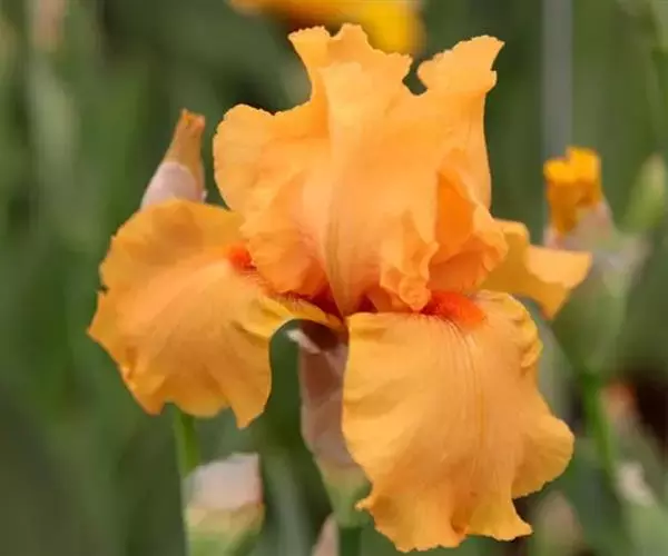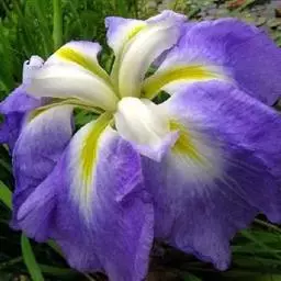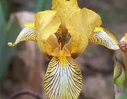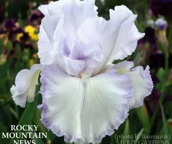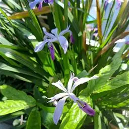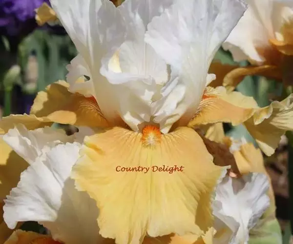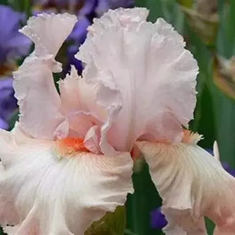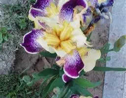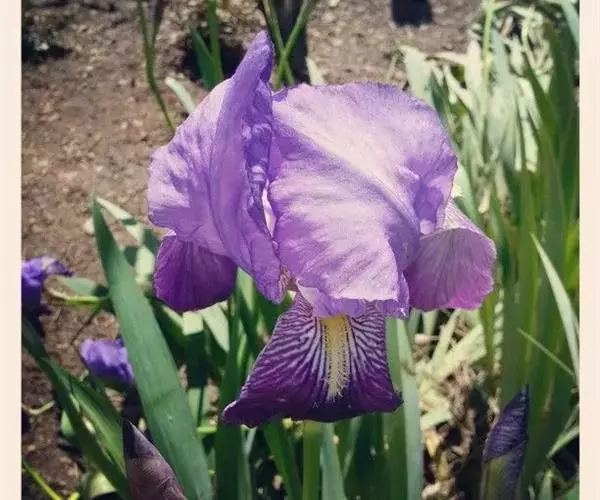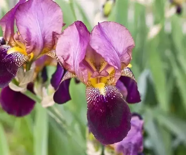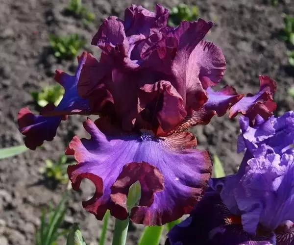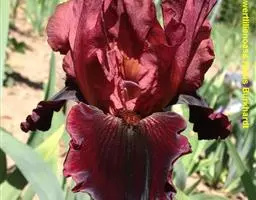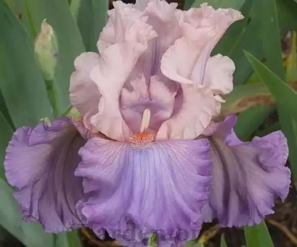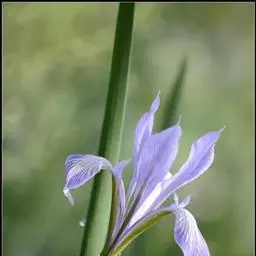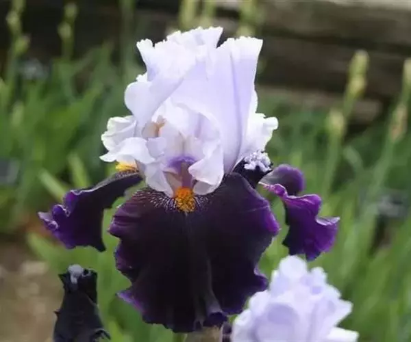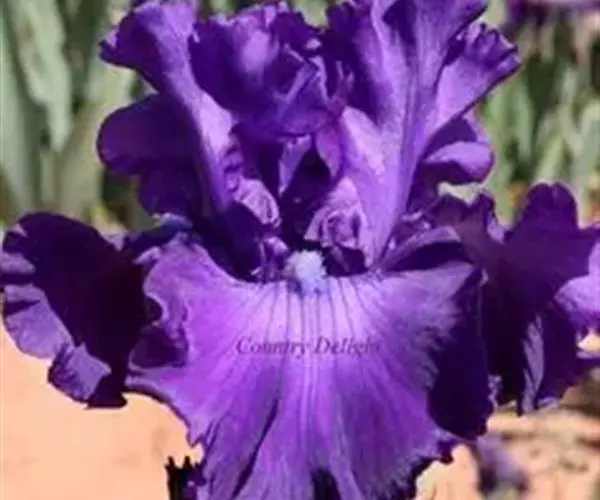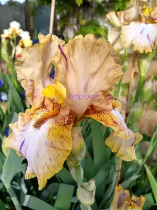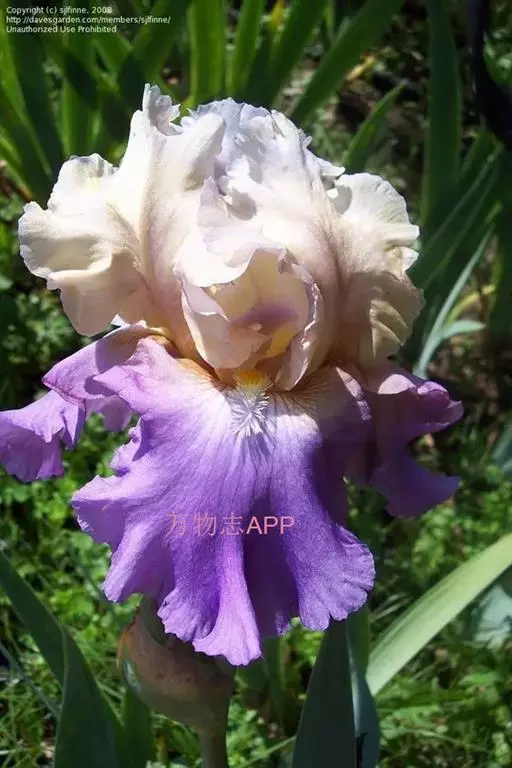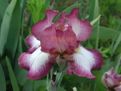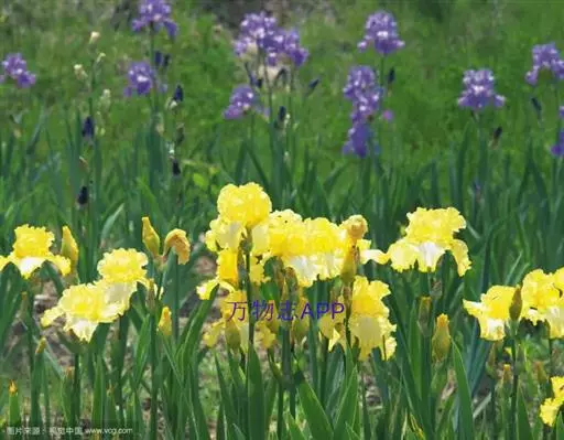 德国鸢尾(学名:Iris germanica L.):多年生草本。根状茎粗壮而肥厚,常分枝,扁圆形,斜伸,具环纹,黄褐色;须根肉质,黄白色。叶直立或略弯曲,淡绿色、灰绿色或深绿色,常具白粉,剑形。花茎光滑,黄绿色,高60-100厘米,上部有1-3个侧枝,中、下部有1-3枚茎生叶;苞片3枚,内包含有1-2朵花;花大,鲜艳,直径可达12厘米;花色因栽培品种而异,多为淡紫色、蓝紫色、深紫色或白色,有香味;花被管喇叭形,长约2厘米,外花被裂片椭圆形或倒卵形,顶端下垂,爪部狭楔形,内花被裂片倒卵形或圆形,长、宽各约为5厘米,直立,顶端向内拱曲,中脉宽,并向外隆起,爪部狭楔形。蒴果三棱状圆柱形,顶端钝,无喙,成熟时自顶端向下开裂为三瓣;种子梨形,黄棕色,表面有皱纹,顶端生有黄白色的附属物。花期4-5月,果期6-8月。