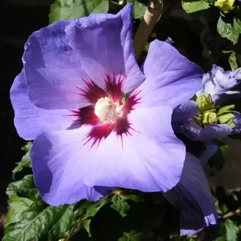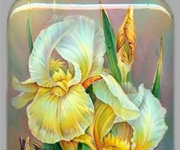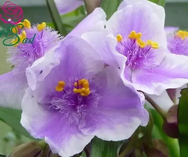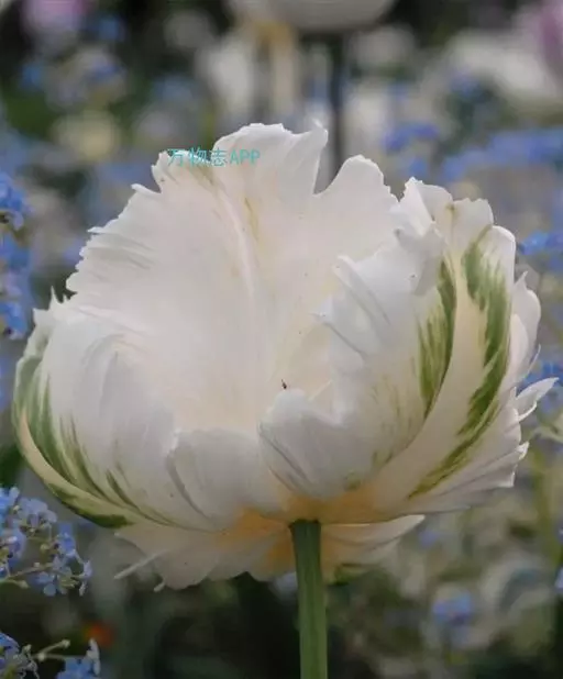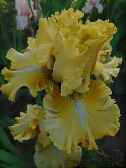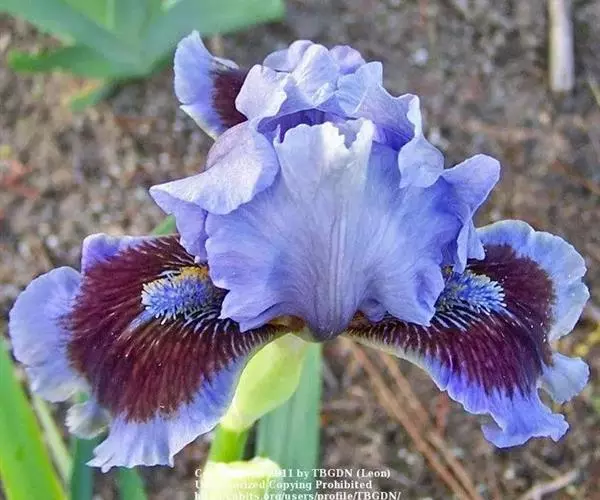 花茎光滑,黄绿色,高60-100厘米,上部有1-3个侧枝,中、下部有1-3枚茎生叶;苞片3枚,草质,绿色,边缘膜质,有时略带红紫色,卵圆形或宽卵形,长2-5厘米,宽2-3厘米,内包含有1-2朵花;花大,鲜艳,直径可达12厘米;花色因栽培品种而异,多为淡紫色、蓝紫色、深紫色或白色,有香味;花被管喇叭形,长约2厘米,外花被裂片椭圆形或倒卵形,长6-7.5厘米,宽4-4.5厘米,顶端下垂,爪部狭楔形,中脉上密生黄色的须毛状附属物,内花被裂片倒卵形或圆形,长、宽各约为5厘米,直立,顶端向内拱曲,中脉宽,并向外隆起,爪部狭楔形;雄蕊长2.5-2.8厘米,花药乳白色;花柱分枝淡蓝色、蓝紫色或白色,长约5厘米,宽约1.8厘米,顶端裂片宽三角形或半圆形,有锯齿,子房纺锤形,长约3厘米,直径约5毫米。
