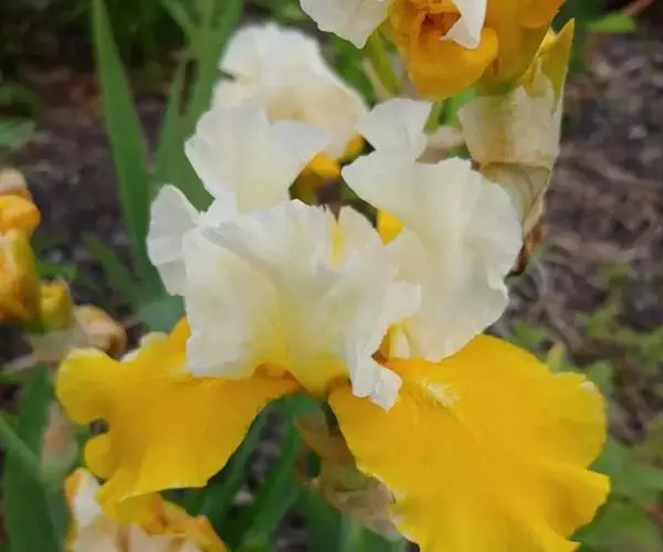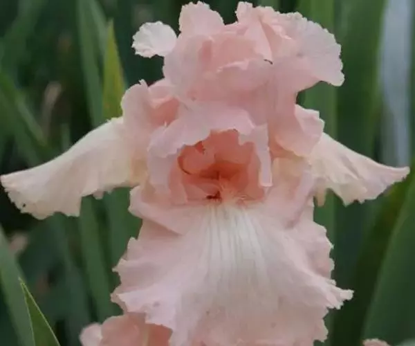 德国鸢尾是多年生草本植物。根状茎粗壮而肥厚,常分枝,扁圆形,斜伸,具环纹,黄褐色;须根肉质,黄白色。叶直立或略弯曲,淡绿色、灰绿色或深绿色,常具白粉,剑形,长20-50厘米,宽2-4厘米,顶端渐尖,基部鞘状,常带红褐色,无明显的中脉。