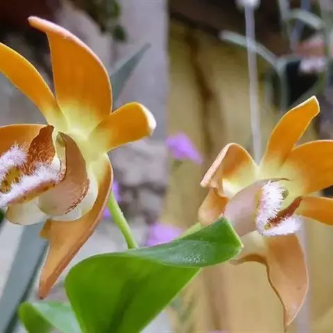 大花文心兰(O.Macranthum),花大,花径10厘米,花瓣黄色,萼片棕色、波状。