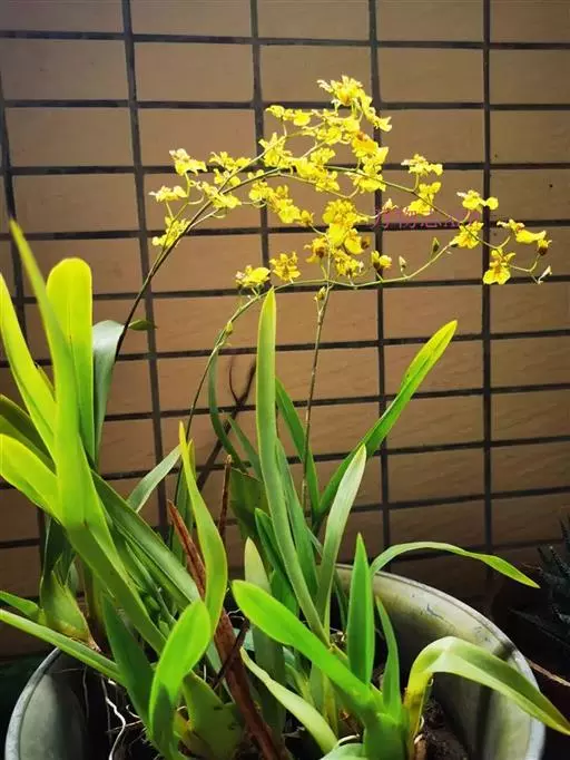 华彩文心兰(O.Splendidum),花黄色、具棕色条纹,唇瓣大、金黄色。