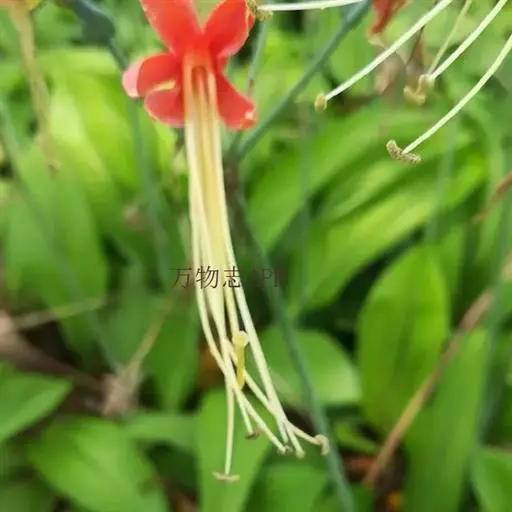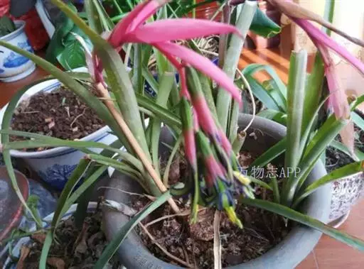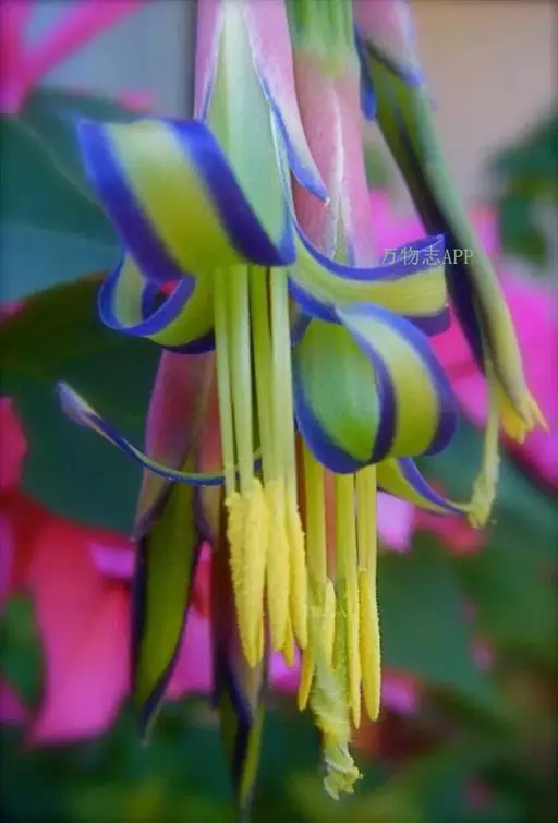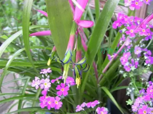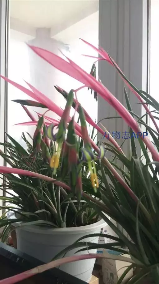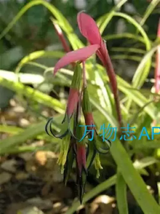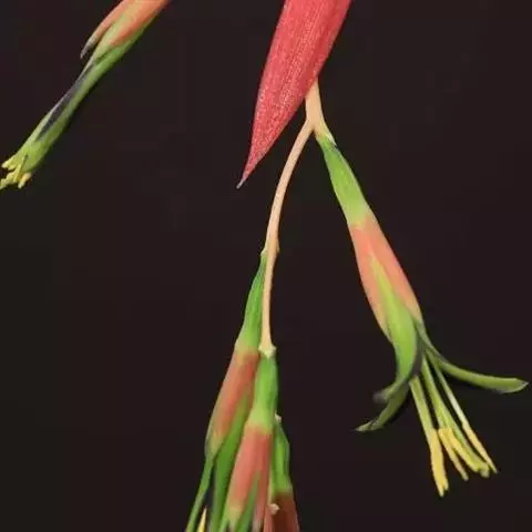 垂花水塔花(Billbergia nutans Wendl.)凤梨科观赏植物,茎极短。叶莲座状丛生,长达50厘米,先端下垂,叶缘有疏小刺;花葶长30厘米,先端下垂,具花4-12朵,无毛,花序轴膝状折曲;总苞片狭、紧贴花葶,粉红色到淡红色;花萼3枚,橙红色,边缘蓝紫色,花瓣3枚,绿色,边缘蓝紫色,先端急尖,反折;雄蕊6枚;花药伸出花外;子房下位,绿色,中轴胎座,柱头扭转。种子多数,小。