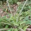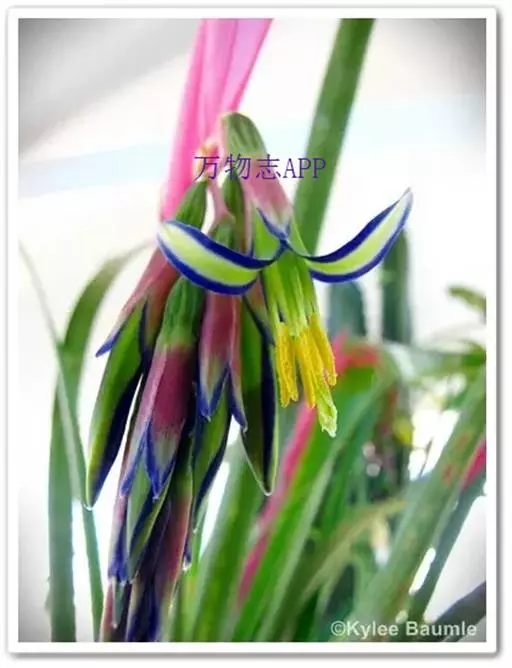 茎极短。叶莲座状丛生,长达50厘米,宽15毫米,先端下垂,叶缘有疏小刺;花葶长30厘米,先端下垂,具花4-12朵,无毛,花序轴膝状折曲;总苞片狭、紧贴花葶,粉红色到淡红色;花萼3枚,长1.3-2.7厘米,橙红色,边缘蓝紫色,花瓣3枚,长3.6-4厘米,绿色,边缘蓝紫色,先端急尖,反折;雄蕊6枚;花药长7毫米,伸出花外;子房下位,绿色,长1厘米,中轴胎座,柱头扭转。种子多数,小。