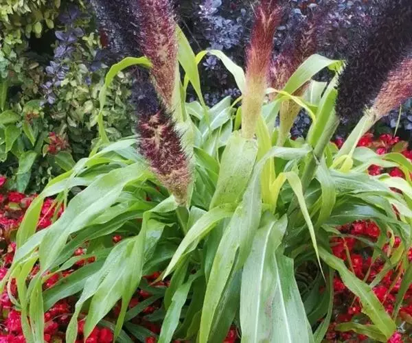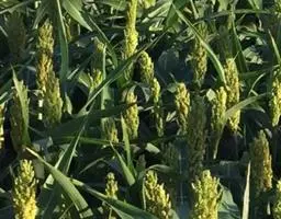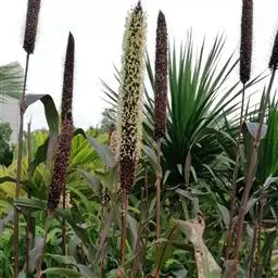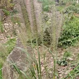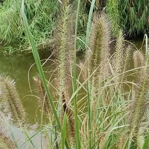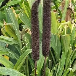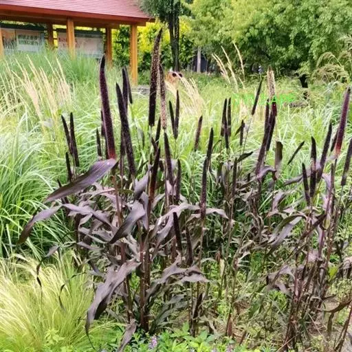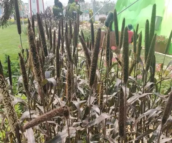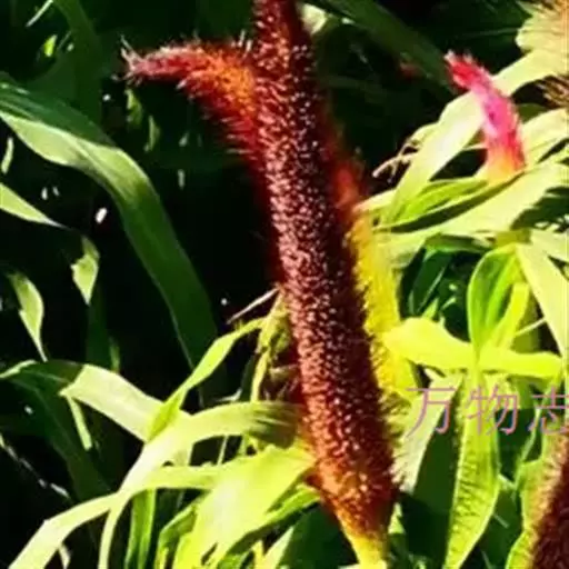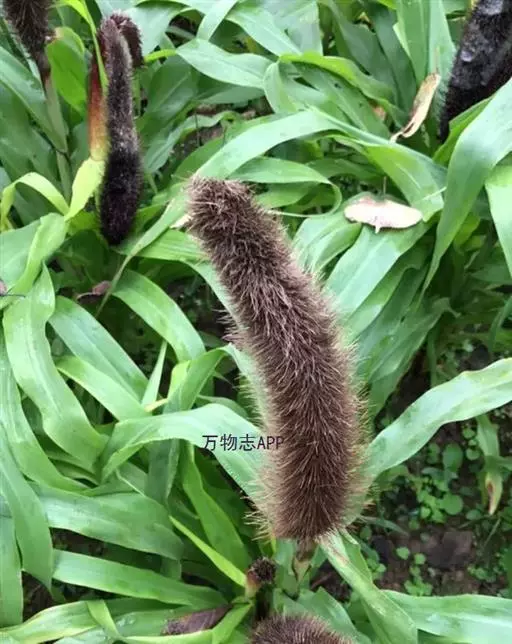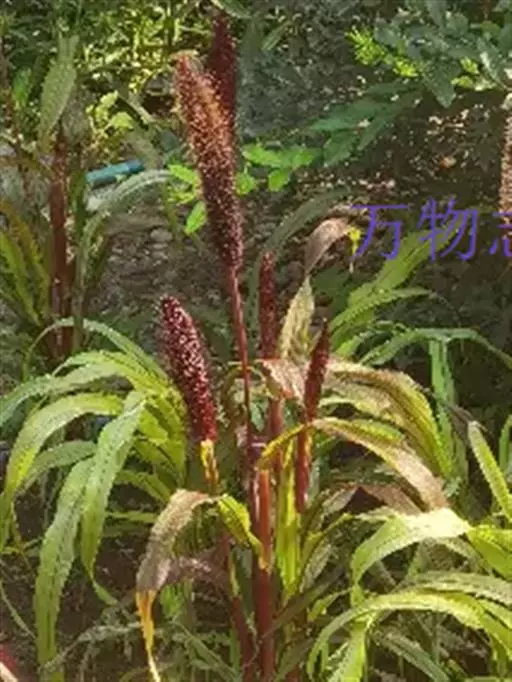 禾本科黍族狼尾草属中的一个种,学名Pennisetumamericana(L.)Leeke,须根系发达,多分布在0-40cm的土层。次生很量很大,植株不易倒伏,总分蘖数可达几十个。茎实髓,圆柱形,粗壮。茎节间光滑,淡绿色,节部有毛,每节上方有浅的槽沟,茎表皮坚硬,有的表面有蜡质。茎中部有分枝,多数可结实。株高一般1.5-3.0m,矮的1m左右,高的可达5m。叶多为披针形,叶缘有细小的锯齿。叶舌是边缘有毛的薄膜。叶鞘裸露,边缘布满白色纤毛。颜色从浅黄色、绿色到紫色。穗较为紧密的圆柱形、圆锥形或纺锤形。穗轴直立,圆形实心。圆锥花序的穗轴周围密生许多小穗,一般1500个左右。基部密生着坚硬的刚毛。小穗由两个小花组成:一个可育,另一个是不完全花。子房倒卵形,光滑。雌蕊一个,雄蕊三个。易脱粒。籽粒形状近似球形,圆锥形或圆柱形。多为灰色、灰褐色,也有紫色和琥珀白色的。千粒重3g左右,高的可达15g。为完全花。花药纵裂,花粉散开。异花授粉的机率很高,一般自然发校率可达50-75%。