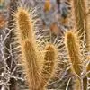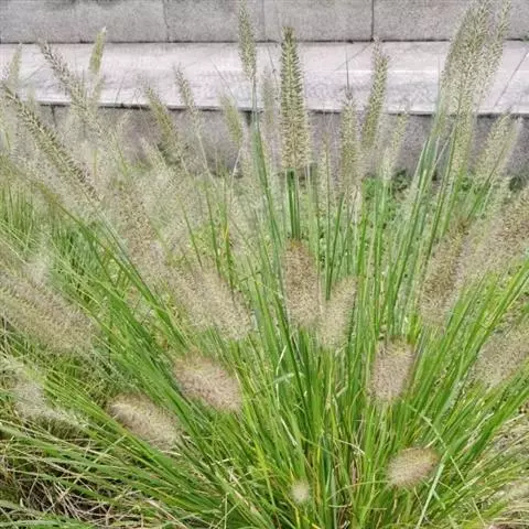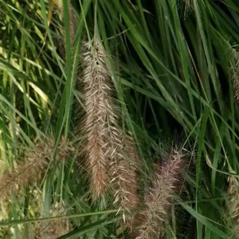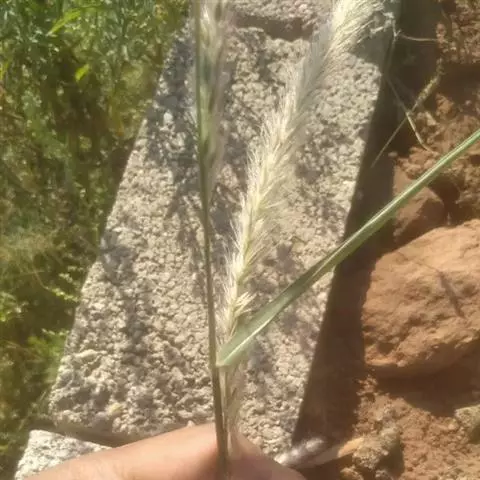 圆锥花序紧密似香蒲花序,长40-50厘米,宽1.5-2.5厘米;主轴粗壮,硬直,密生柔毛;总梗长2-5毫米,密生柔毛;小穗通常双生于一总苞内成束,倒卵形,长3.5-4.5毫米,基部稍两侧压扁;刚毛短于小穗,粗糙或基部生柔毛;颖膜质,具细纤毛;第一颖微小,长约0.8毫米;第二颖长1.5-2毫米,具3脉;第一小花雄性,第一外稃长约2.5毫米,先端截平,边缘膜质,具纤毛,具5脉,内稃薄纸质,遍生细毛;第二小花两性,第二外稃长约3毫米,先端钝圆,具纤毛,具5-6脉(基部不明显);鳞被退化;雄蕊3,花药顶端具毫毛。颖果近球形或梨形,成熟时膨大外露,长约3毫米;花柱基部联合。叶表皮细胞结构为上下表皮不同型;上表皮脉间最中间2-3行为短筒状六角形或五角形、壁薄、无波纹或微波纹长细胞,邻近1-3行为壁厚、深波纹长细胞,靠叶脉2-3行为长筒状壁厚、有波纹的长细胞与短细胞交叉排列;下表皮为壁厚、有波纹的长细胞与短细胞交叉排列。染色体2n=14 (Rou N.,1929b; Karper,Chisholm, 1936; Burton, 1942; Krisbnaswamy,1951)。花果期9-10月。
