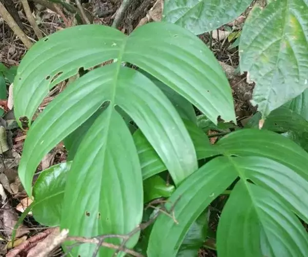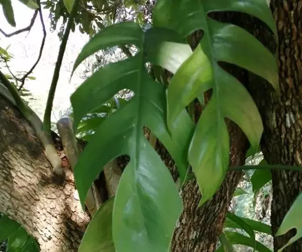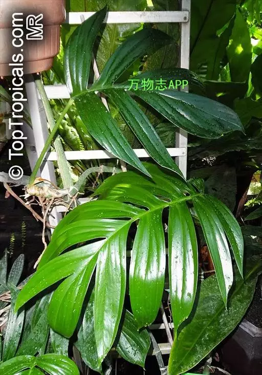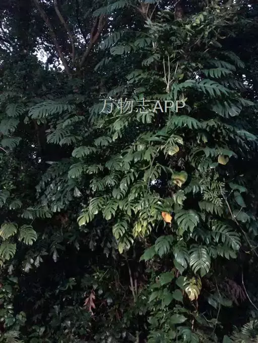 藤本植物,攀援极高。茎圆柱形,粗壮,下部粗2.5-4厘米,多分枝;气生根具发达的皮孔,平伸,紧贴于树皮或石面上。叶柄长25-40厘米,上部有长2.2厘米的膨大关节;叶鞘膜质,上达关节部位,逐渐撕裂,脱落;叶片薄革质,幼叶狭披针形或披针状长圆形,基部浅心形,成熟叶宽的长圆形,基部宽心形,沿中肋有2行星散的、有时为长达2毫米的小穿孔,叶片长40-60厘米,宽30-40厘米,两侧不等地羽状深裂,裂片线形,基部和顶端等宽或略狭,裂弯宽5-7.5厘米,狭长渐尖,裂片上有叶片的I级侧脉1-3条,II级侧脉与I级侧脉成极小的锐角,后逐渐与之平行。花序柄圆柱形,粗壮,长10-14厘米,基部有鞘状鳞叶包围。佛焰苞外面绿色,内面黄色,长10-12厘米,渐尖。肉穗花序圆柱形,钝,长约10厘米,粗3厘米。雌蕊具棱,长5-6毫米,顶平,柱头无柄,线形,纵向;胚珠2-4,着生于胎座的近基部。种子肾形,稍光滑。花期4-5月。