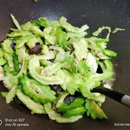 2、将炸好的豆干放入锅中,加少许水,烧开后调入盐、味精,加香菇略煮捞出;