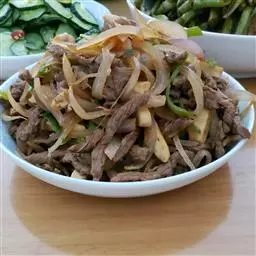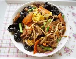 阳泉市所属平定县有道名菜:粉条豆腐丝。这道菜主料是粉条和油豆腐丝,成菜特点是,豆腐丝是炸过的,外脆里嫩,菜看着很温和,没有一点热菜的感觉,但吃起来烫嘴,所以,地道的饭店都会说,我们做得是不冒烟的正宗粉条豆腐丝。此菜是阳泉、晋中一带一般人家红白喜事,请客吃饭都会有的一道传统菜。近些年各饭店推出的深受老百姓喜欢的创新菜--茴子白炒粉条与粉条豆腐丝有异曲同工之妙。