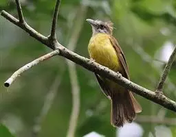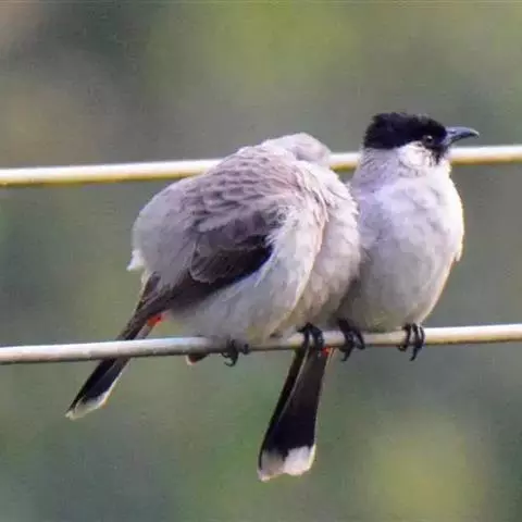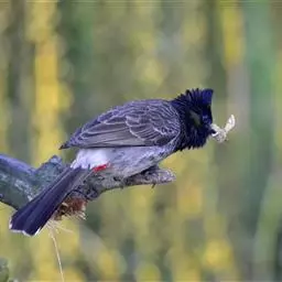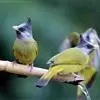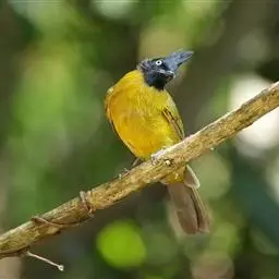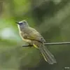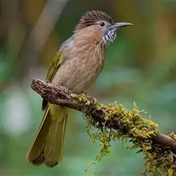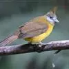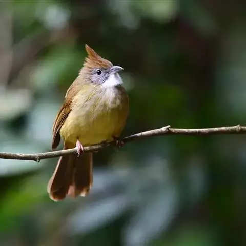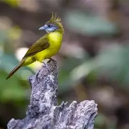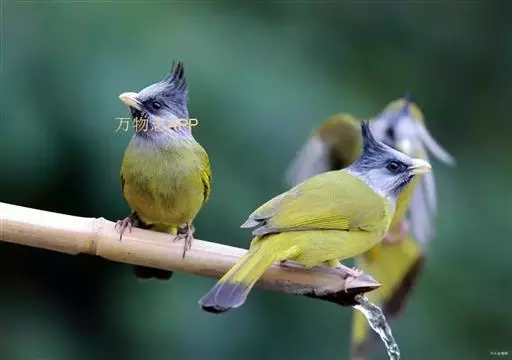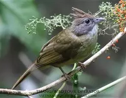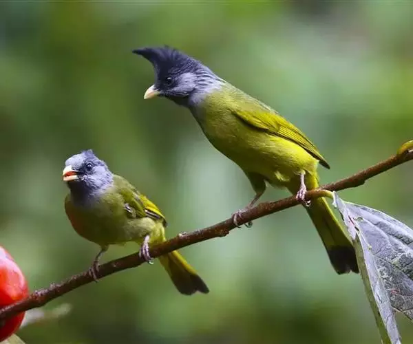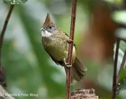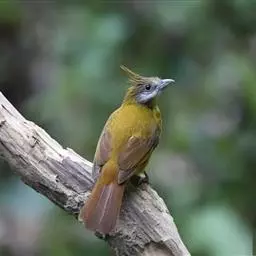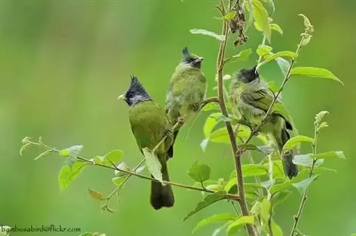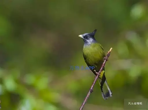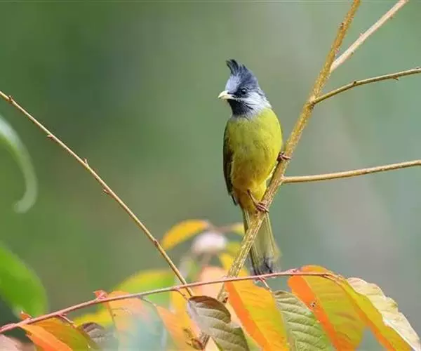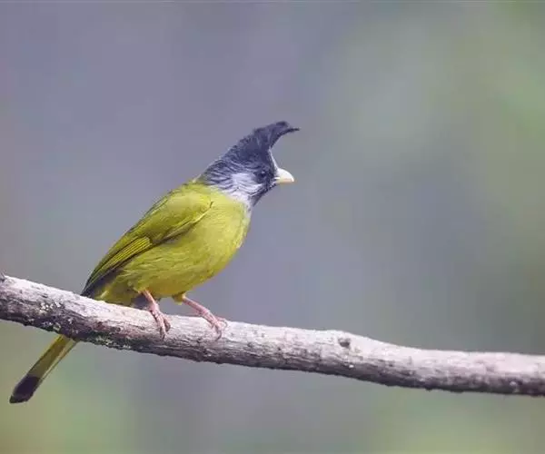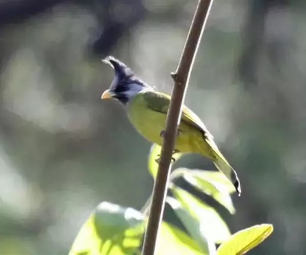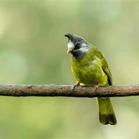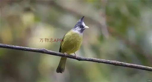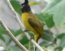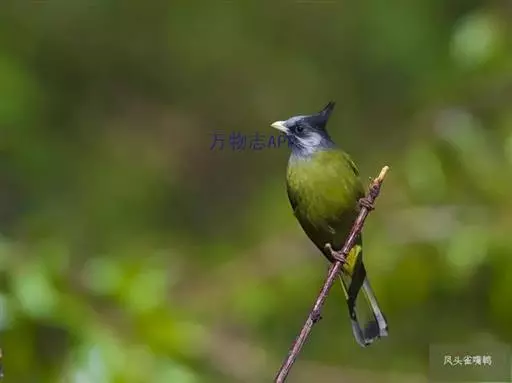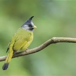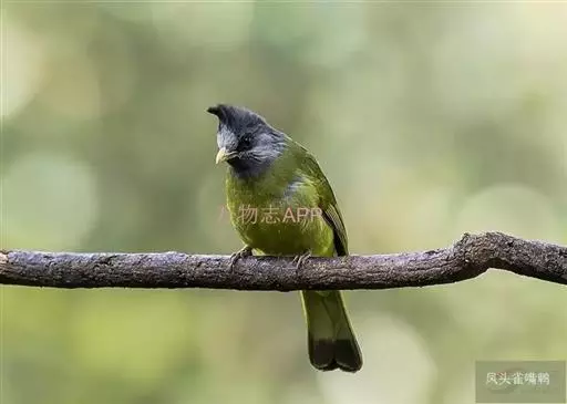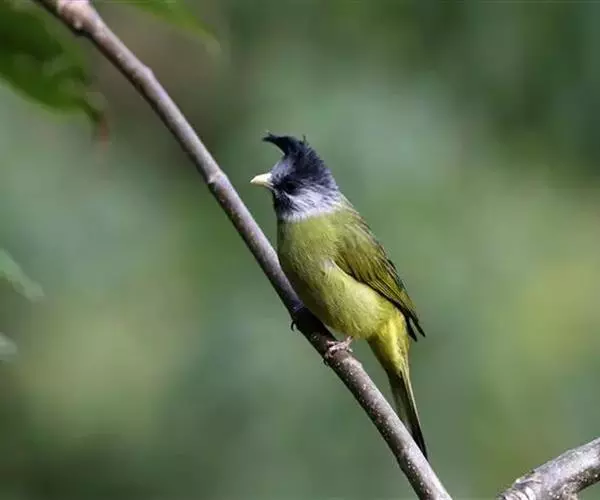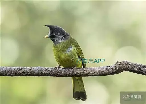 凤头雀嘴鹎(学名:Spizixos canifrons):属小型鸟类,体长18-22厘米。嘴粗短、呈象牙色或乳黄色,前额和脸灰色,头顶黑色,有一朝前竖立的黑色羽冠。上体橄榄绿色,下体黄绿色,尾羽黄绿色具宽阔的黑褐色端斑。