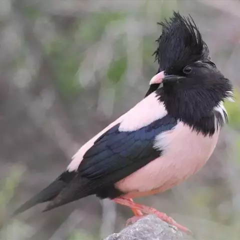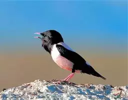 粉红椋鸟:中等体型,成鸟体长19-22厘米,体重60-73克,飞羽、尾羽为亮黑色,雌鸟与雄鸟毛色相似,…