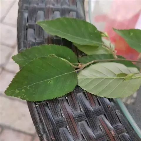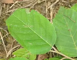 叶卵形或卵状矩圆形,长3-8厘米,宽2-5厘米,顶端渐尖,基部圆形或微心形,较少宽楔形,边缘具不规则的重锯齿,齿尖常角质化,上面深绿色,无毛或幼时疏被长柔毛,下面淡绿色,密生腺点,沿脉疏被白色长柔毛,侧脉10-14对,脉腋间通常无髯毛,有时具稀疏的髯毛;叶柄长5-15厘米,疏被长柔毛或无毛。