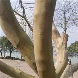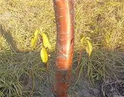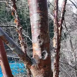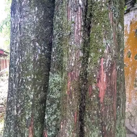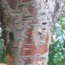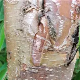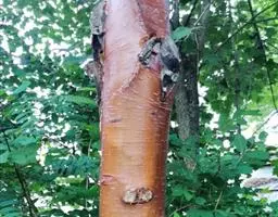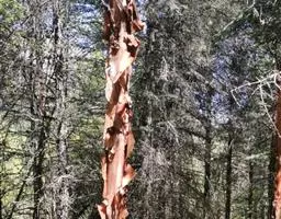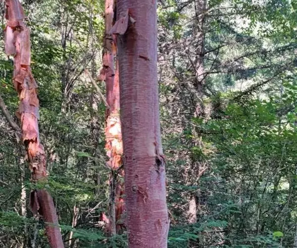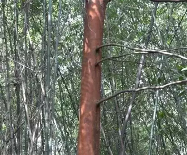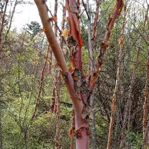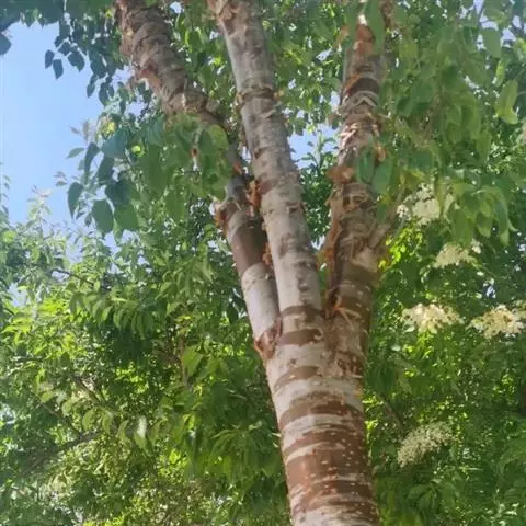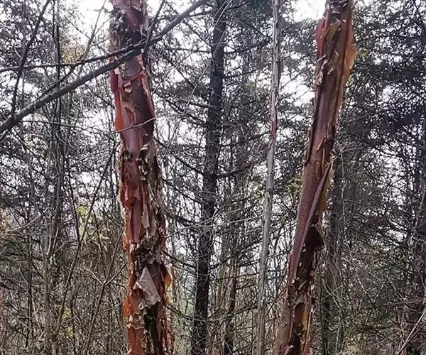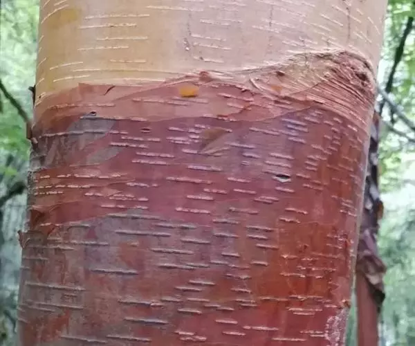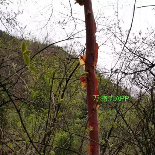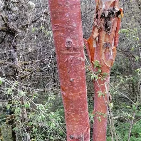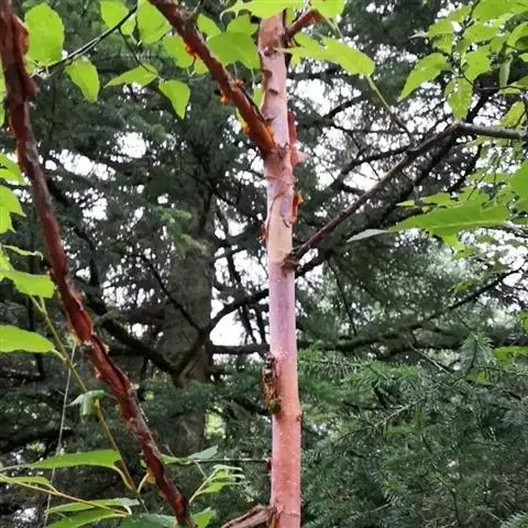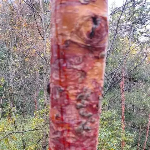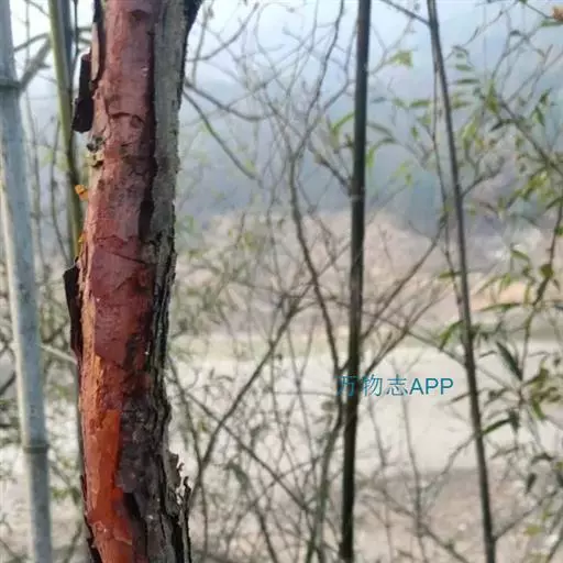大乔木,高可达30米;树皮淡红褐色或紫红色,有光泽和白粉,呈薄层状剥落,纸质;枝条红褐色,无毛;小枝紫红色,无毛,有时疏生树脂腺体;芽鳞无毛,仅边缘具短纤毛。