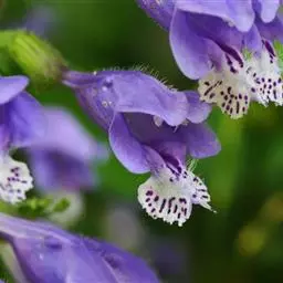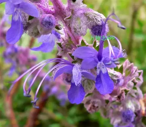 轮伞花序具3-7花,腋生,常偏向于一侧,具长不及1毫米的总梗,组成通常长4厘米的伸长的顶生穗状花序,在上部者较密集,在下部者远离,有时在主轴顶端由于侧生花枝紧缩而聚集成圆锥花序,此时花序甚伸长,长达10厘米;苞片及小苞片线状钻形,锐尖,比花梗长,长3-5毫米,被微柔毛;花梗长0.5-1.5毫米,与总梗均被微柔毛。花萼管状,连齿长约7.5毫米,常具色泽,外面在脉上被微柔毛,脉间具腺点,内面无毛,显著15脉,齿间凹陷由于二脉连结而多少呈瘤状,萼齿5,三角状披针形,长约2.5毫米,先端具短刺尖头。花冠浅蓝至紫色,长约1厘米,外面除下唇中裂片及冠筒基部外均被微柔毛,内面无毛,冠筒长约7.毫米,几不超出花萼,冠檐二唇形,上唇卵圆形,直伸,长约2.5毫米,先端2裂,下唇开张,3裂,中裂片宽大,宽超过二侧裂片,侧裂片卵圆形。雄蕊4,前对较长,明显伸出花冠,后对较短,稍伸出花冠,花丝丝状,无毛,花药卵圆形,2室,室叉开。花柱略超出雄蕊,向前弯,先端相等2浅裂。花盘平顶。子房无毛。花期6月。