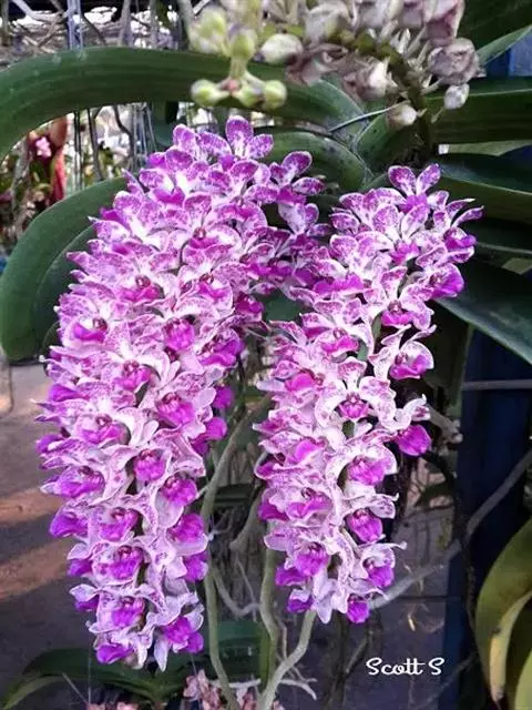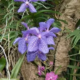 小蓝万代兰:兰科,万代兰属附生草本植物。茎长可达8厘米或更长,叶多少肉质,带状斜立,花序近直立,…