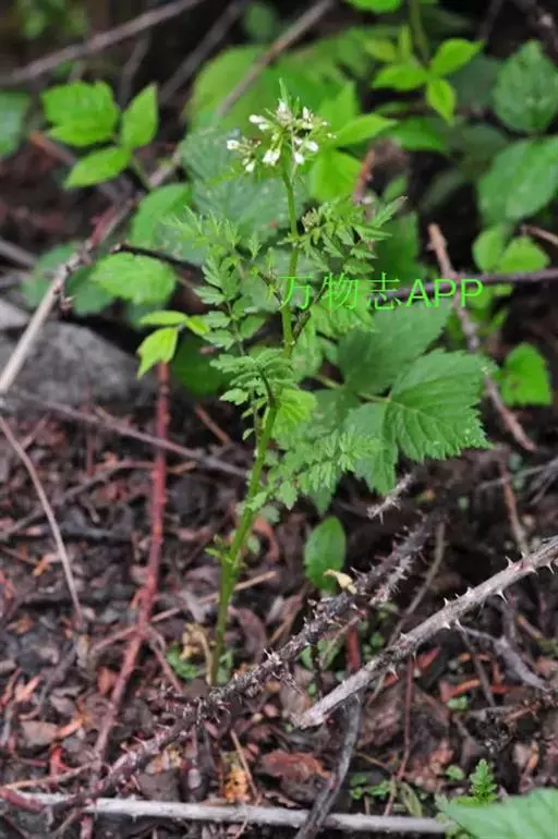 一年生或二年生草本,高20-60cm。茎直立,不分枝或有时上部分枝,表面有沟棱,有少数短柔毛或无毛。羽状复叶;基生叶叶柄长1-3cm,边缘通常有短柔毛,基部稍扩大,有1对托叶状耳;小叶2-8对,顶生小叶卵形,长6-13mm,宽4-8mm,边缘有不整齐钝齿状浅裂,小叶柄显著,侧生小叶与顶生的相似,自上而下渐小,通常生于最下的1-2对近于披针形,全缘,都有显著的小叶柄;茎生叶有柄,基部也有抱茎线形弯曲的耳,长3-8mm,小叶5-8对,卵形,侧生小叶与其相似,但较小;最上部的茎生叶小叶片较狭,边缘少齿或近于全缘;全部小叶散生短柔毛,有时无毛,边缘均有缘毛。总状花序顶生或腋生,花多数,形小,果期花序延长;萼片4,长椭圆形;花瓣4,白色,狭长椭圆形,长2-3mm,基部稍狭;雄蕊6,4长2短,长雄蕊长2.8-3mm,短雄蕊长约1.8mm;雌蕊1,子房柱状,花柱极短,柱头比花柱略宽。长角果线形,稍扁,长20-28mm,果瓣无毛,成熟时自下而上弹性旋裂。种子椭圆形,长1-3mm,棕黄色,边缘有极狭的翅。花期4-6月,果期5-7月。