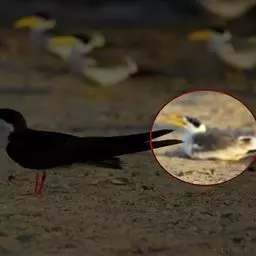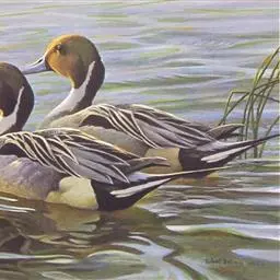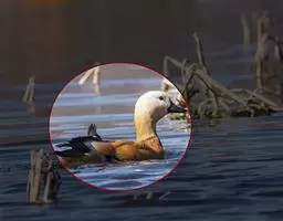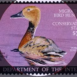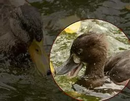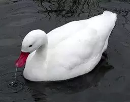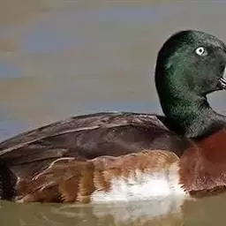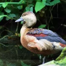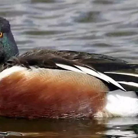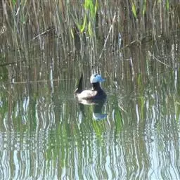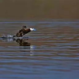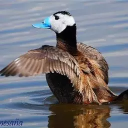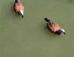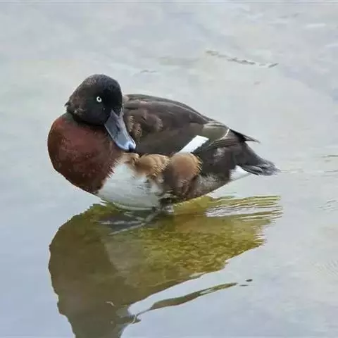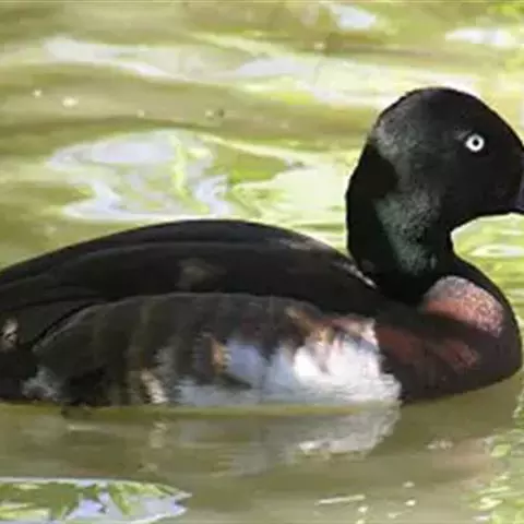 麝鸭(学名:Biziura lobata):雄性麝鸭是澳大利亚最大的水鸭,具有强壮的体形,羽色黯淡。嘴部有瘤疣附生物,羽毛散出一种近似麝香的香气(尾脂腺分泌物)。属于硬尾鸭亚科,具有长而坚硬的尾羽,游泳时尾羽可没入水中,而有时尾羽可以竖起,如同扇子的形状。主要吃植物性食物,也吃水生昆虫、甲壳类、青蛙等水生动物。