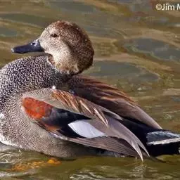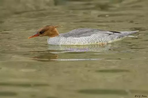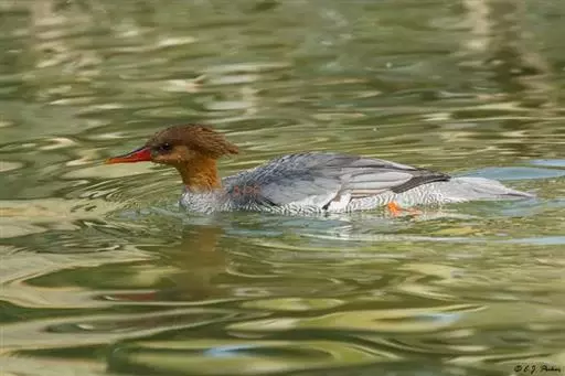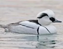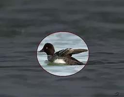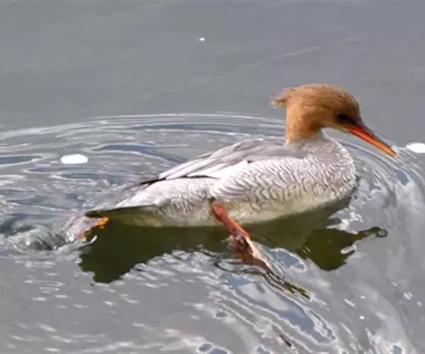 雌鸟的头和颈棕褐色;上背褐色;下背、腰和尾上覆羽由褐色逐渐变为灰色,并具白色横斑;尾黑褐色,沾灰色;下体白色,肩和下体两侧具鳞状斑。色暗而多灰色,与红胸秋沙鸭的区别在于体侧具同轴而灰色宽黑色窄的带状图案。