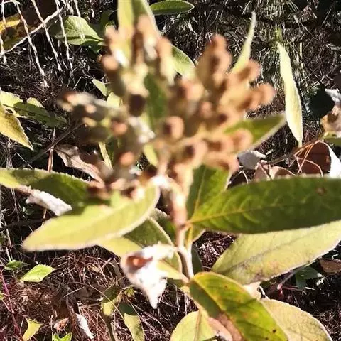 叶多少开展,长圆形或长圆状披针形;中部叶长10-16厘米,有长约0.5厘米的柄,上部叶渐小近无柄;全部叶基部圆形或近楔形,顶端钝或急尖,边缘有小尖头状细齿或浅齿,上面被基部疣状的密糙毛,沿中脉被较密的毛,下面被白色或污白色绢状厚茸毛;中脉和10-12对侧脉在下面高起,网脉明显。