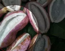 花雌雄同株,红色紫红色暗紫色绿白色或淡黄色,数朵组成伞房式的短总状花序;总花梗短,长8-20毫米,多个簇生于叶腋,基部为阔卵形的芽鳞片所包。雄花:花梗长10-15毫米,外轮萼片线状长圆形,长10-15毫米,宽3-4毫米,顶端钝,内轮的较小;花瓣极小,近圆形,直径不及1毫米;雄蕊直,长约10毫米,花丝圆柱状,药隔延伸为长约0.7毫米的凸头,药室线形,退化心皮小,锥尖。雌花:紫红色;花梗长3.5-5厘米,外轮萼片倒卵状圆形或广卵形,长14-16毫米,宽7-9毫米,内轮的较小;花瓣小,卵状三角形,宽0.4毫米;退化雄蕊无花丝,长约0.7毫米;心皮棍棒状,柱头头状,具罅隙。果紫色,长圆形,长5-9厘米,顶端圆而具凸头;种子椭圆形,长5-8毫米,厚4-5毫米,种皮褐黑色,有光泽。花期4-5月,果期7-8月。