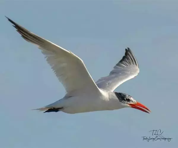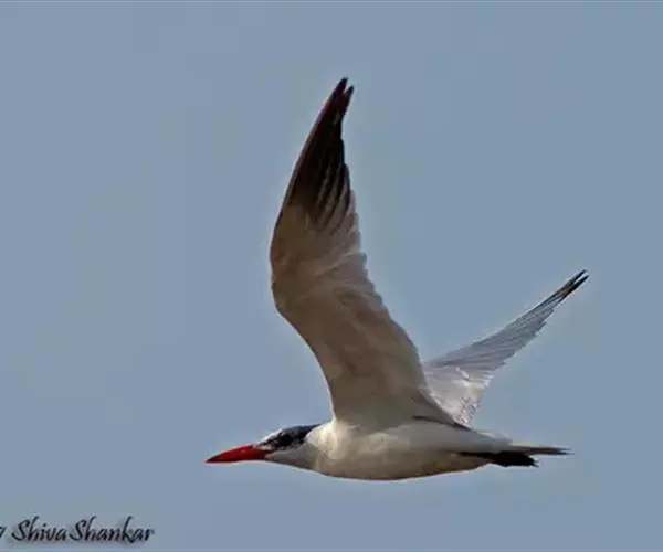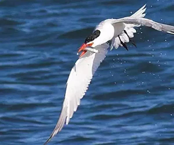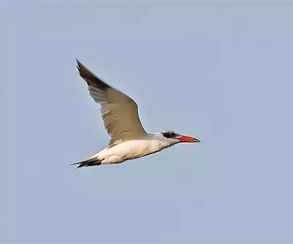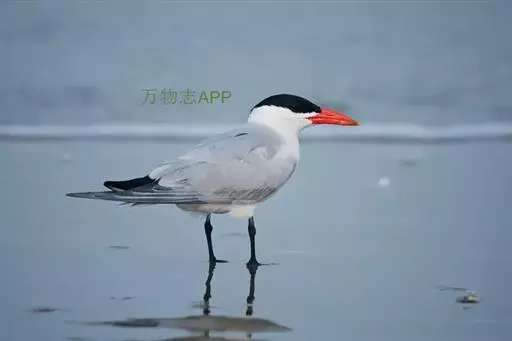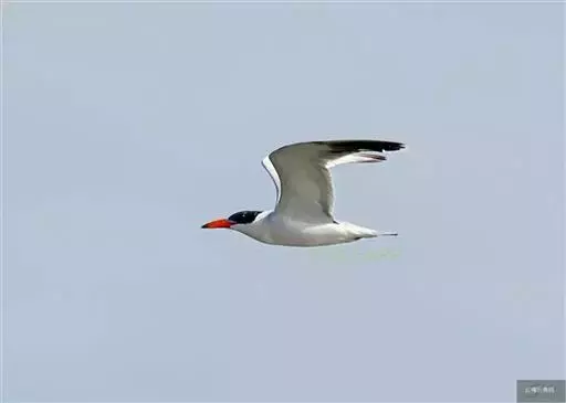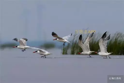 红嘴巨鸥(学名:Sterna caspia),大型水鸟,体长47~55厘米。夏羽前额、头顶、枕和冠羽黑色。后颈、尾上覆羽和尾白色,尾呈叉状。背、肩和翅上覆羽银灰色。眼先和眼及耳羽以下头侧白色;颏、喉和整个下体也为白色。冬羽和夏羽大致相似,但额和头顶白色,具黑色纵纹。有些头全为白色,仅耳区有黑色斑。上体较淡。主要栖息于海岸沙滩、平坦泥地、岛屿和沿海沼泽地带。常成小群在一起营巢,很少单独成对营巢的。卵的颜色为赭色、绿白色、赭白色或淡褐色,被有淡褐色或黑色斑点。