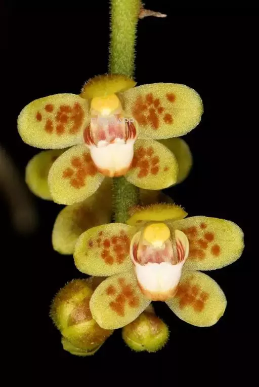 异型兰植物茎不明显,通常无叶,至少在花期时无叶。花序1-2个,下垂,不分枝,长达26厘米,密布茸毛,绿色带紫色斑点;花序轴长约为花葶全长的4/5-1/2,疏生多数花;花序柄被数枚膜质鳞片状鞘;花苞片膜质,卵状披针形,长3-4毫米,先端短急尖,具1条脉,背面疏生短硬毛;花梗和子房长约4毫米,密布短毛;花质地稍厚,萼片和花瓣茶色或淡褐色,除基部外周边为浅白色,具5条脉,背面密布短毛;中萼片向前倾,卵状椭圆形,长5-6毫米,宽4-5毫米,先端圆形;侧萼片卵圆形,与中萼片等大,先端圆形。