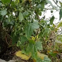 一年生草质攀援藤本;茎稍粗壮,具明显的棱角,被短柔毛。卷须粗壮,下部具棱,常3歧,有短柔毛。叶柄粗壮,棱上具柔毛,长8-12厘米;叶片近圆形,膜质,长、宽均为15-20厘米,常为5-7浅裂,中间裂片宽三角形,稍长,其余的裂片不等大,基部裂片最小,顶端急尖或渐尖,边缘疏生锯齿,基部弯缺近圆形,深2-2.5厘米,宽1-2厘米,上面深绿色,粗糙,下面苍绿色,两面脉上有短柔毛。