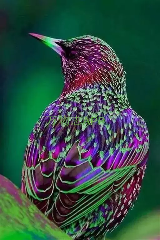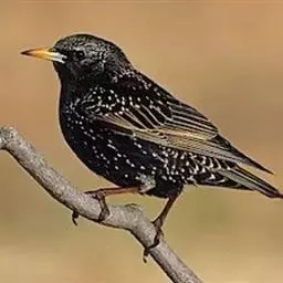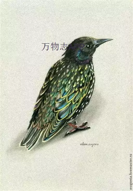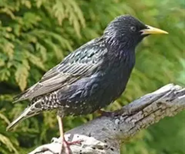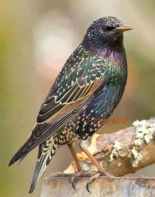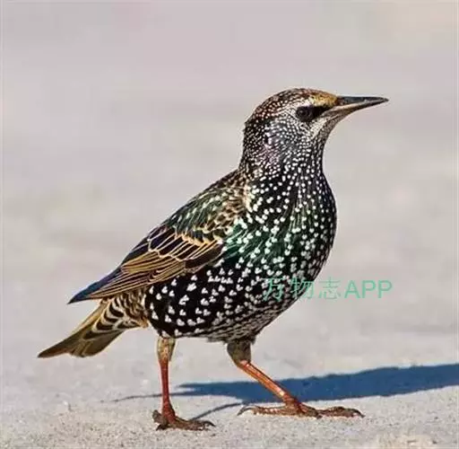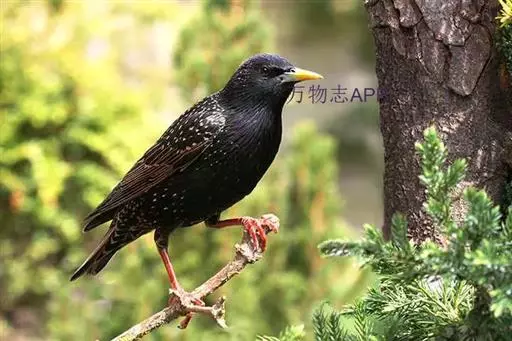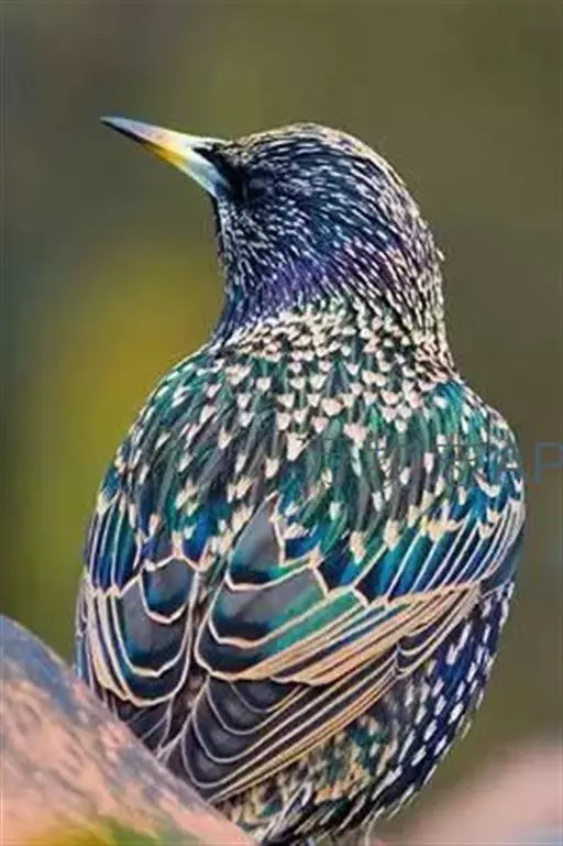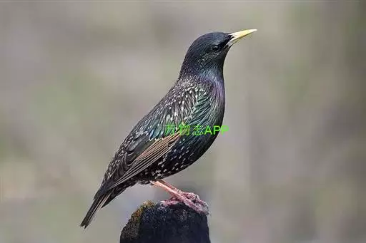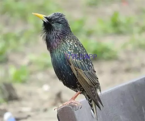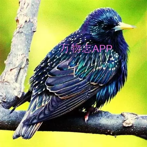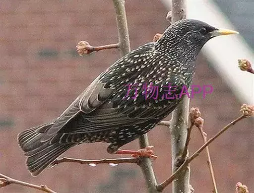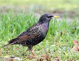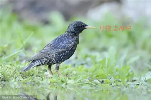 紫翅椋鸟(学名:Sturnus vulgaris):全长约20-24厘米,是中等体型的椋鸟。体羽新时为矛状,羽缘锈色而成扇贝形纹和斑纹,旧羽斑纹多消失。闪辉黑、紫、绿色。具不同程度白色点斑。虹膜深褐色;嘴黄色;脚略红。